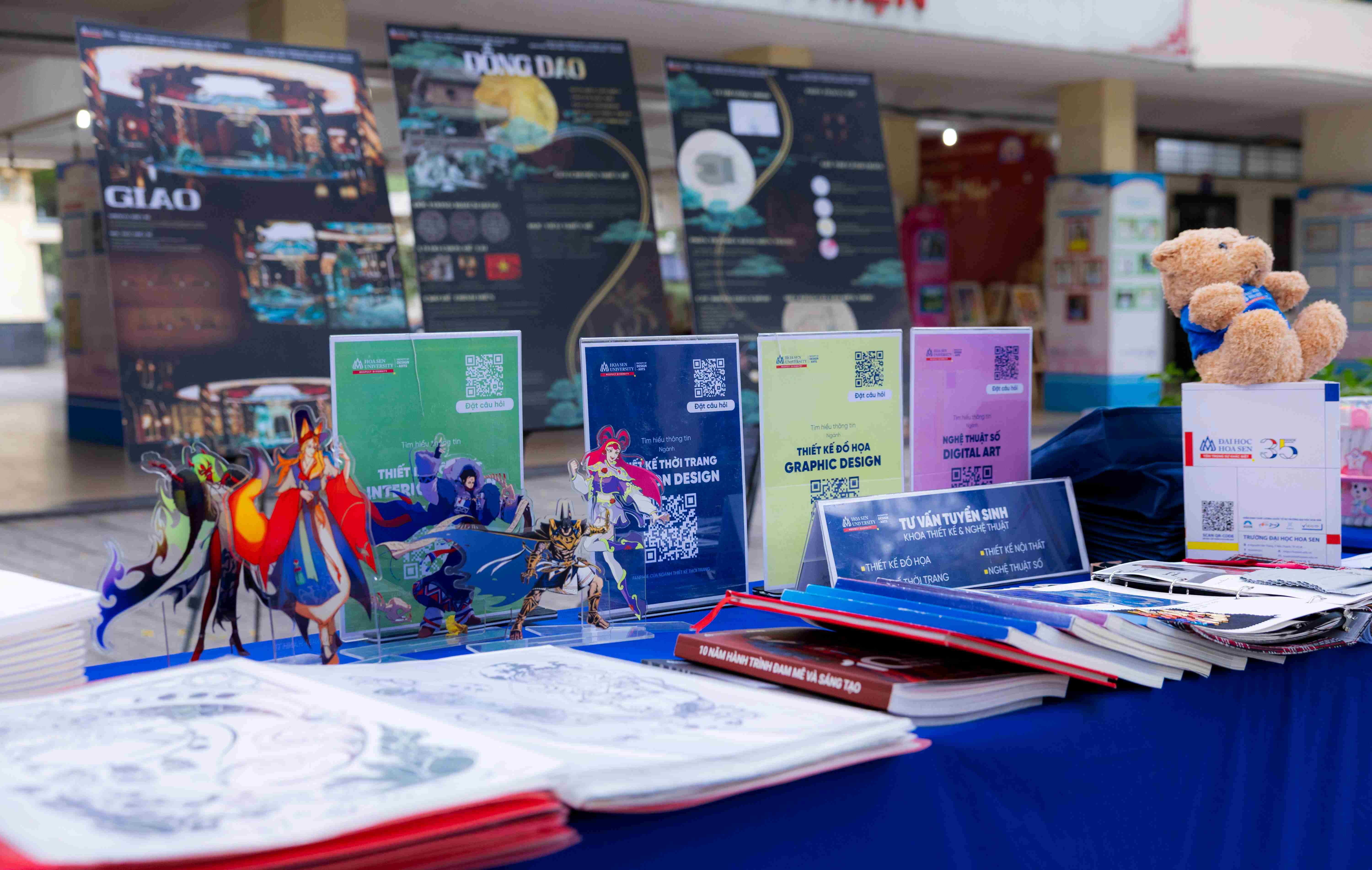 Gian hàng Khoa Thiết kế – Nghệ thuật thu hút học sinh bằng khu vực trưng bày sản phẩm sáng tạo từ sinh viên HSU, cùng hoạt động vẽ và nộp bài dự thi cho Cuộc thi Nhà thiết kế tương lai 2025. Các hoạt động mang đến góc nhìn trực quan về quá trình học tập trong lĩnh vực thiết kế. Bên cạnh đó, rất nhiều bạn dành thời gian tìm hiểu về các ngành học nghệ thuật, sáng tạo tại Trường Đại học Hoa Sen.