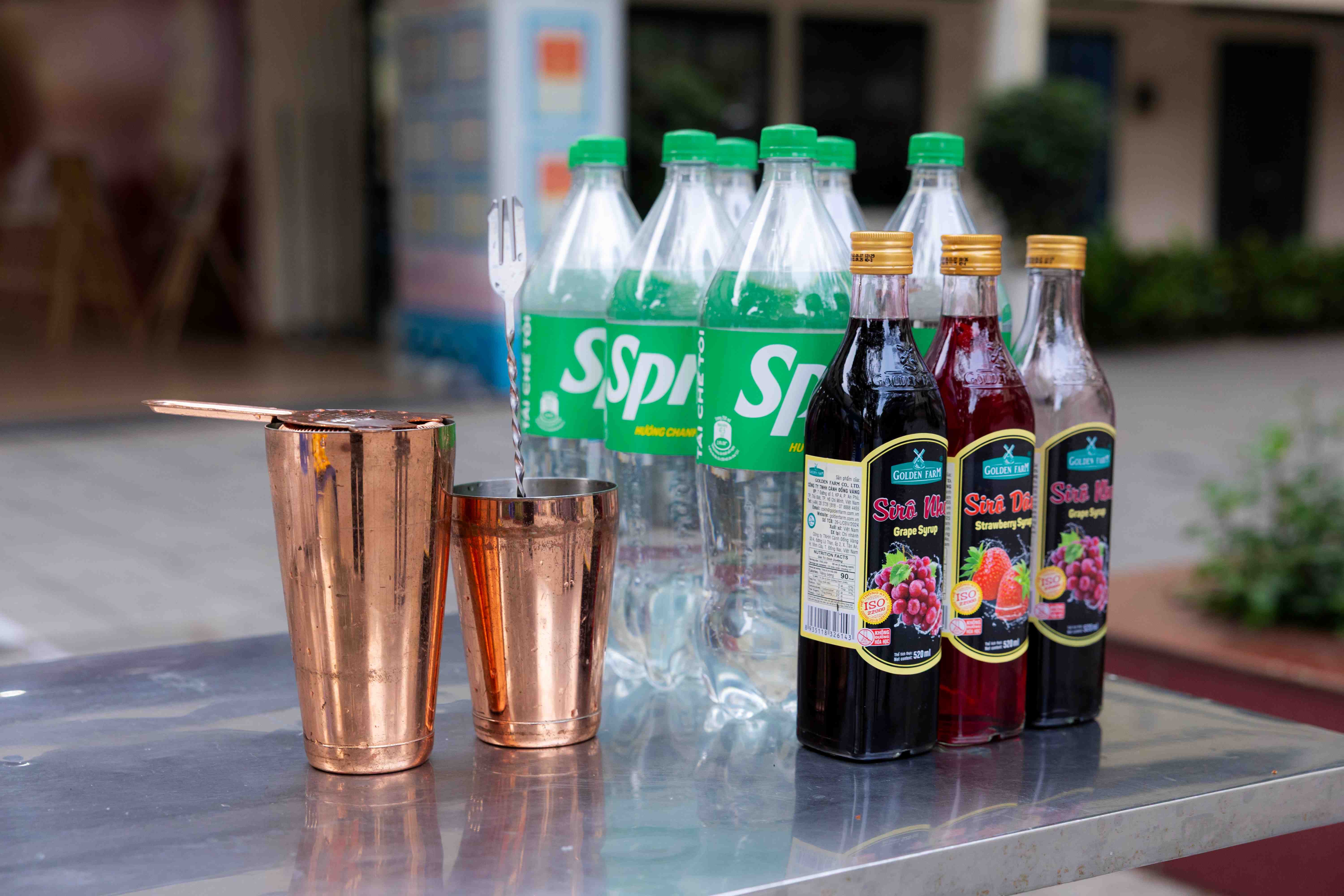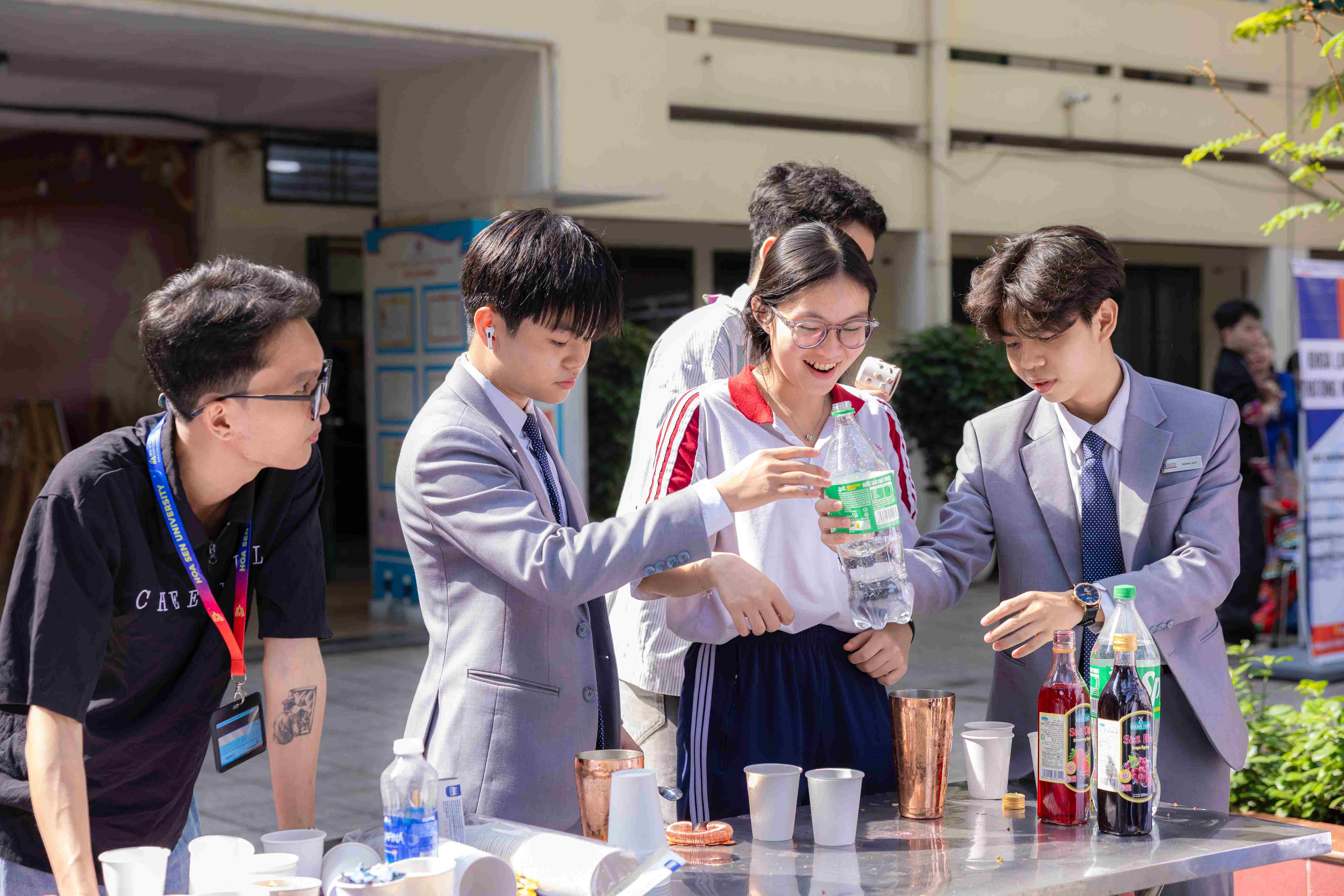 Tại gian hàng của Khoa Du lịch – Nhà hàng – Khách sạn, học sinh thử sức với hoạt động pha chế nước uống cùng quầy bar di động. Những thao tác tưởng chừng đơn giản lại giúp các em hiểu hơn về tính tỉ mỉ và sự chuyên nghiệp trong ngành dịch vụ.