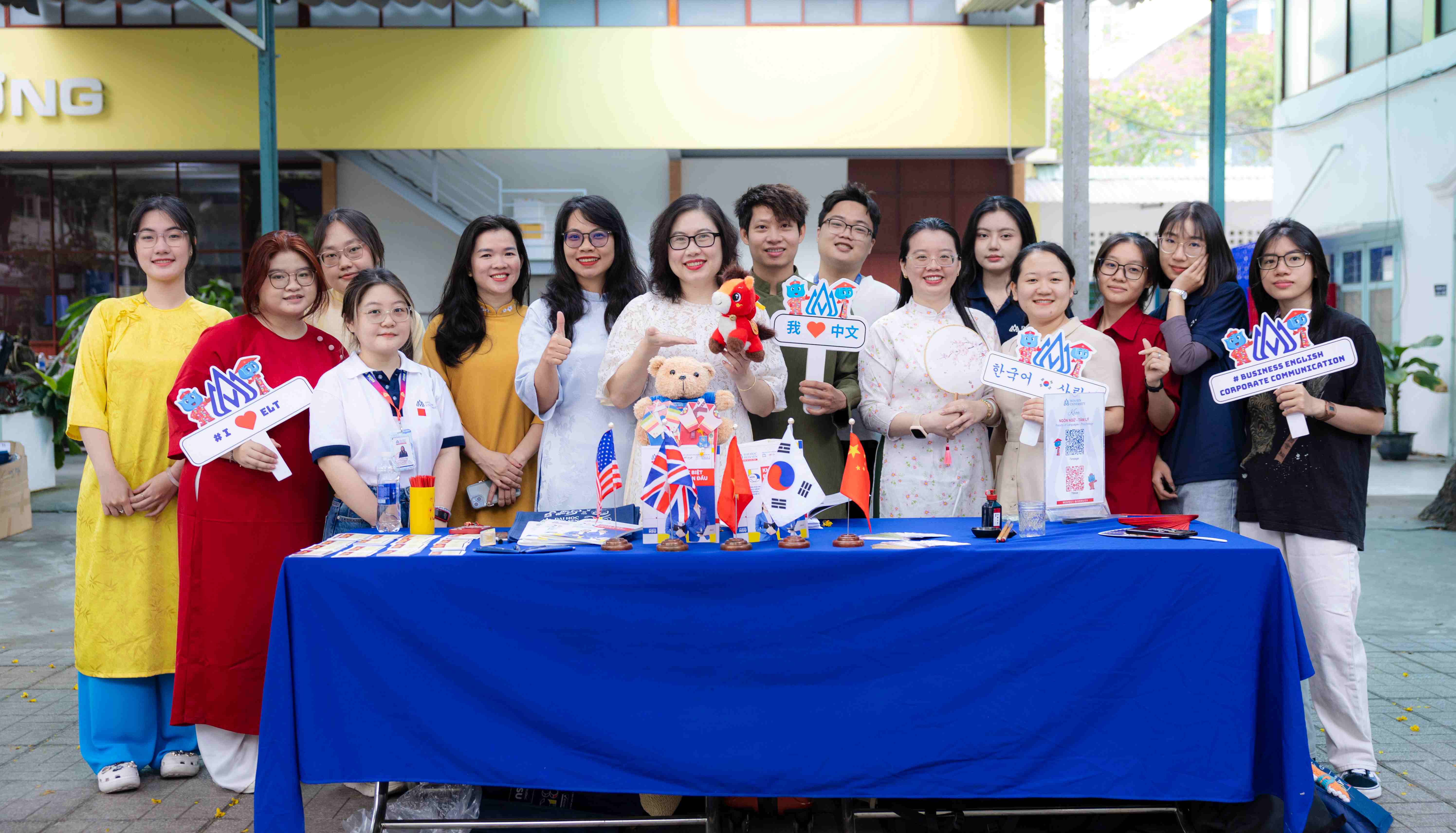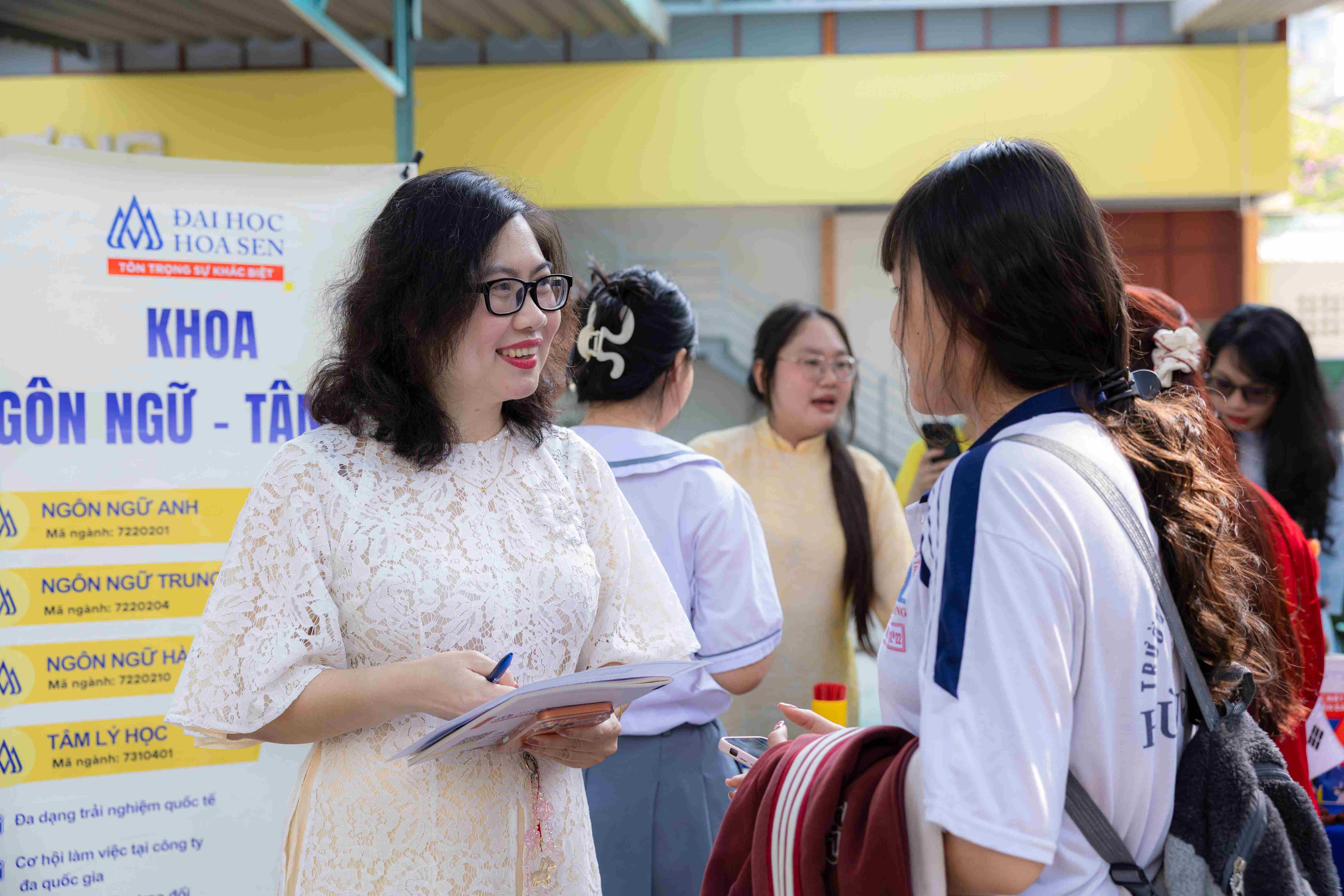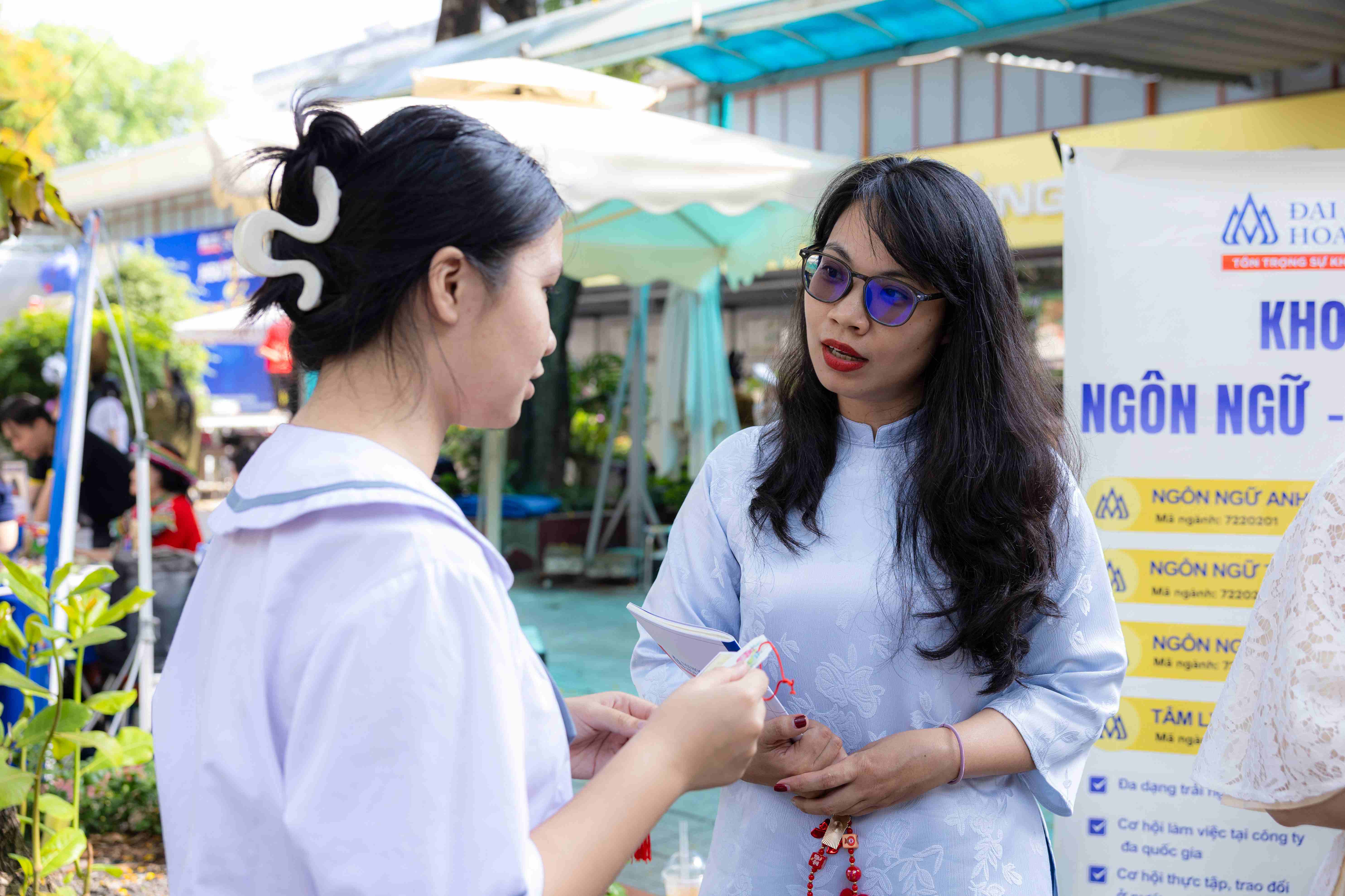 Ở khu vực gian hàng Khoa Ngôn ngữ – Tâm lý, học sinh được tham gia những trò chơi tương tác vui nhộn như thử phản xạ ngôn ngữ, ném phi tiêu, gieo quẻ, tư vấn nghề nghiệp. Các hoạt động mang tính kết nối giúp các em vừa thư giãn vừa khám phá những nét đặc trưng của lĩnh vực ngôn ngữ và tâm lý học. Không khí trò chuyện thân thiện khiến gian hàng luôn sôi động.