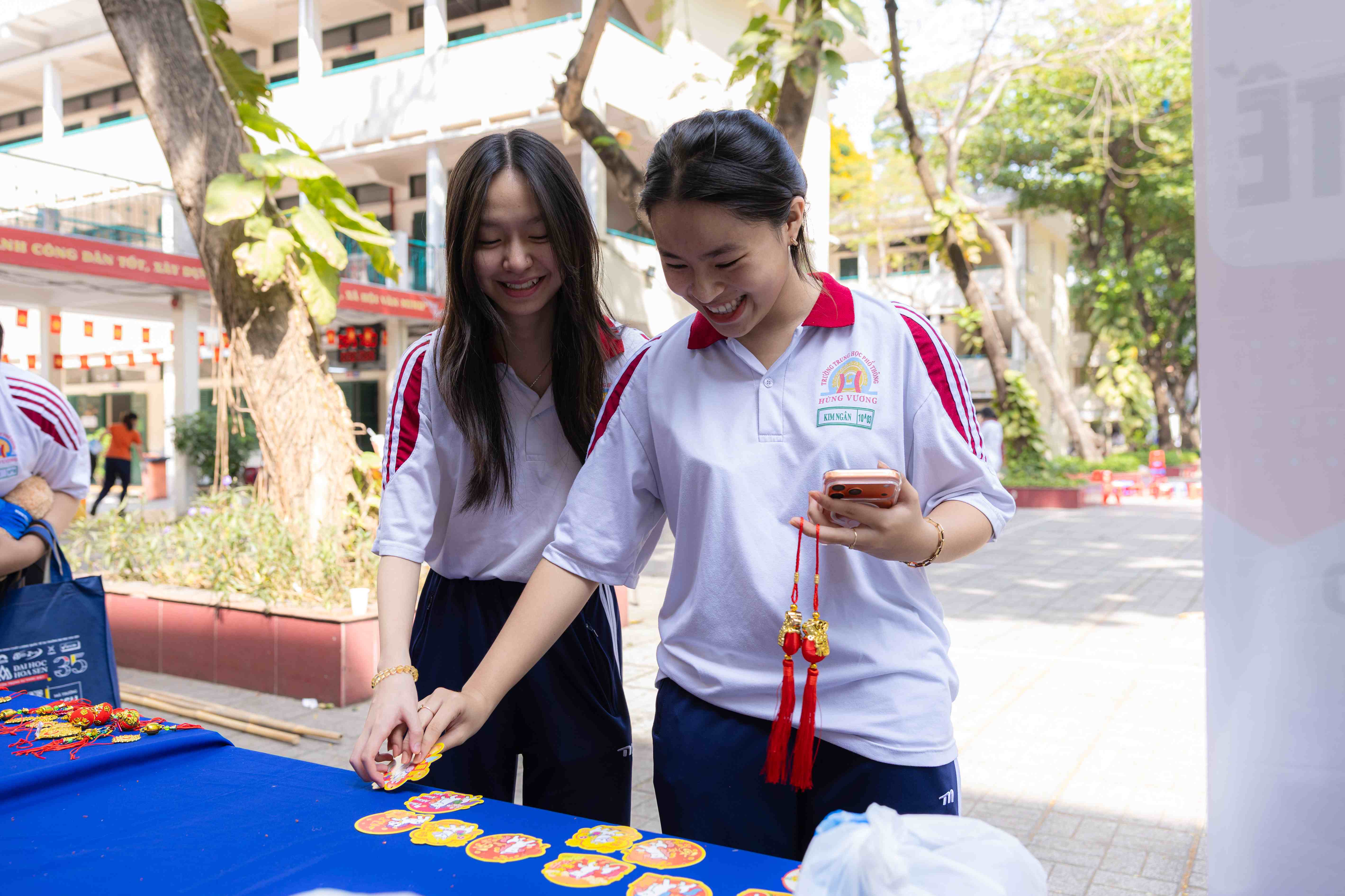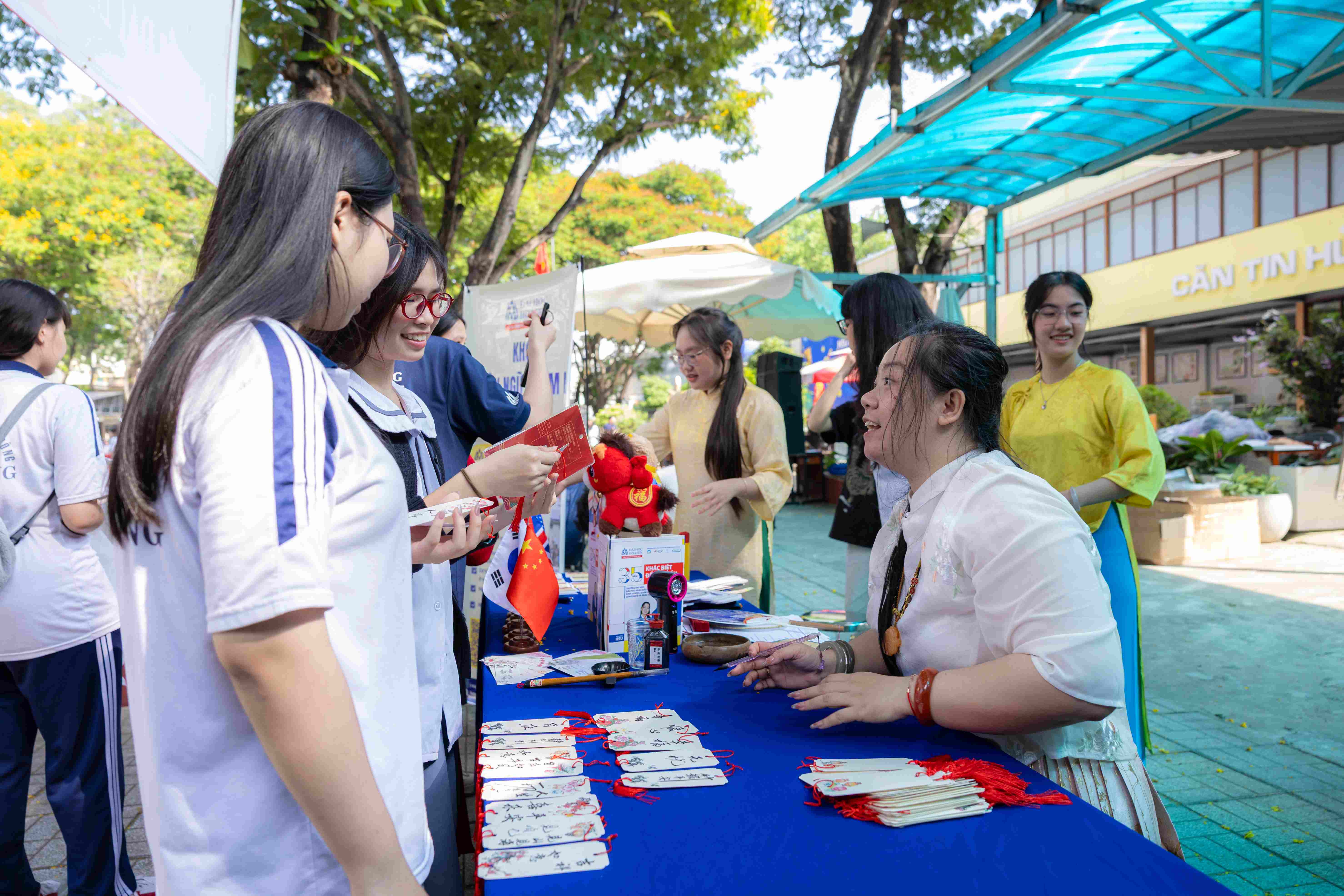 Khu vực gian hàng Viện Đào tạo và Hợp tác quốc tế mang đến không gian mang màu sắc đa văn hóa, với hoạt động chuẩn bị thiệp Tết bằng tiếng Anh và trang trí gian hàng. Học sinh được tìm hiểu về môi trường học tập quốc tế và cơ hội trao đổi, chuyển tiếp. Những hoạt động nhẹ nhàng nhưng gần gũi giúp các em tiếp cận ngoại ngữ trong bối cảnh thực tế.