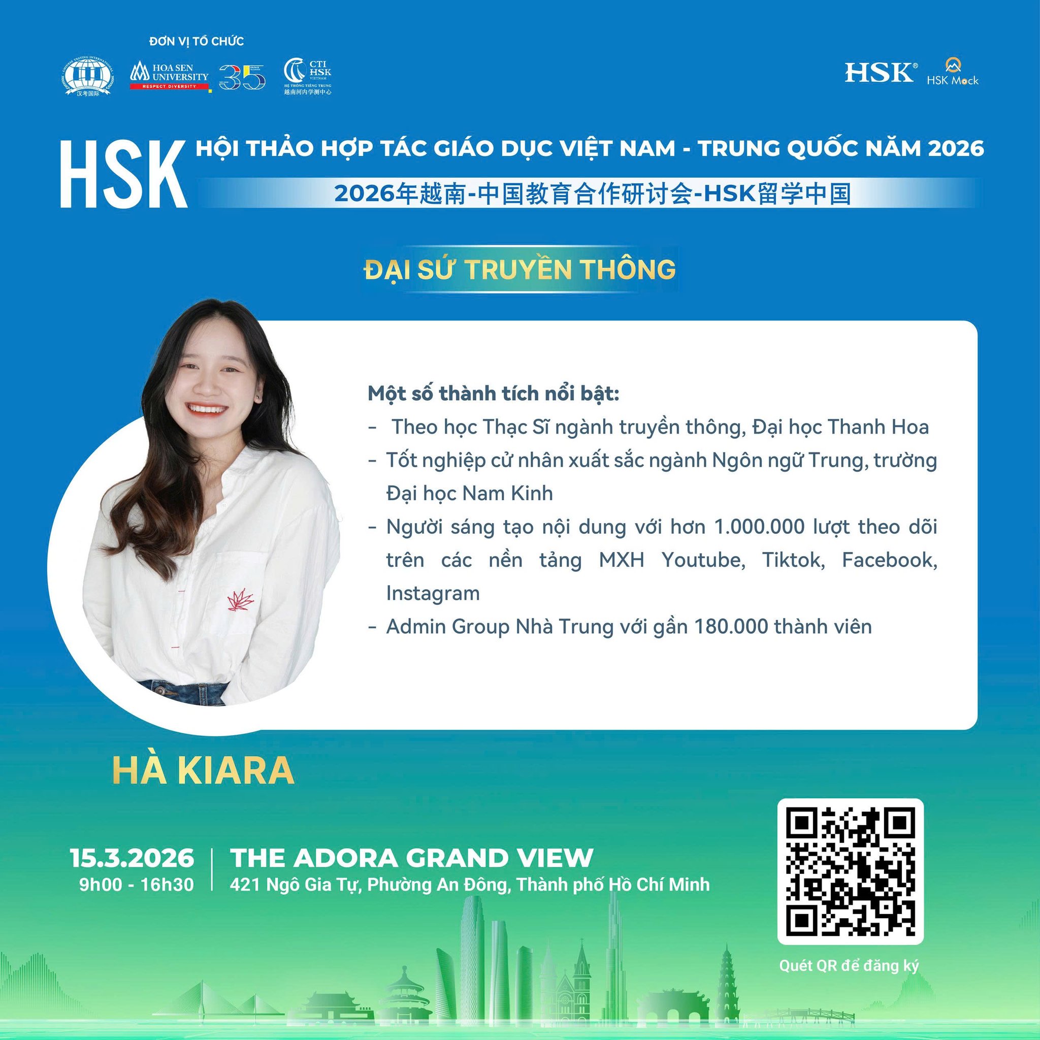 Sự tham gia của các diễn giả và nhà sáng tạo nội dung trong lĩnh vực ngôn ngữ – du học được kỳ vọng sẽ mang đến nhiều góc nhìn thực tế, truyền cảm hứng và giúp người tham dự hiểu rõ hơn về hành trình học tập tại Trung Quốc.