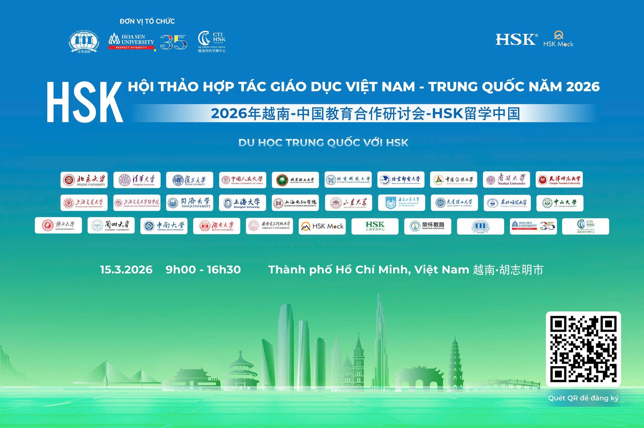 Trường Đại học Hoa Sen phối hợp cùng Hệ thống Tiếng Trung CTI HSK Việt Nam đồng đảm nhận vai trò đơn vị đăng cai tổ chức Hội thảo hợp tác giáo dục Việt Nam – Trung Quốc năm 2026 với chủ đề “Du học Trung Quốc với HSK”. Sự kiện dự kiến quy tụ hơn 30 trường đại học hàng đầu Trung Quốc, cùng các tổ chức giáo dục và đông đảo học sinh, sinh viên quan tâm đến cơ hội học tập quốc tế.