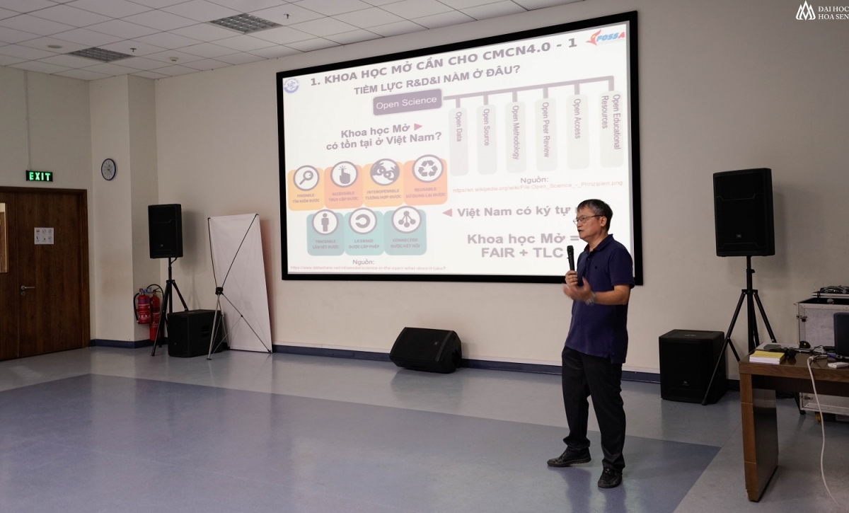 TS. Lê Trung Nghĩa đã trình bày các nội dung cụ thể như: Khoa học mở rất cần cho Cách mạng công nghiệp 4.0; Tìm kiếm & khai thác nguồn tài nguyên thông tin mở cho nghiên cứu, giảng dạy; Hệ thống giấy phép nguồn mở, tính tương thích của các loại giấy phép và các lĩnh vực sử dụng giấy phép mở.
