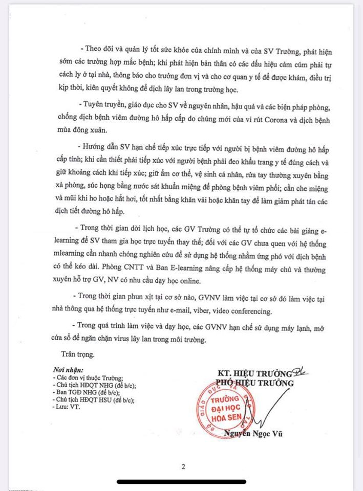 Thực hiện Chỉ thị 05/CT-TTg ngày 28/01/2020, Công điện số 121/CĐ-CP ngày 23/01/2020 của Thủ tướng Chính phủ, Công điện số 43/CĐ-BGDĐT ngày 28/01/2020 của Bộ Trưởng Bộ Giáo dục và Đào tạo về việc phòng, chống dịch bệnh viêm đường hô hấp cấp do chủng mới của virus Corona (nCoV), ngày 31/01/2020, Trường Đại học Hoa Sen (HSU) đã chủ động thông báo đến giảng viên, nhân viên nhà trường phương án phòng chống dịch bệnh.