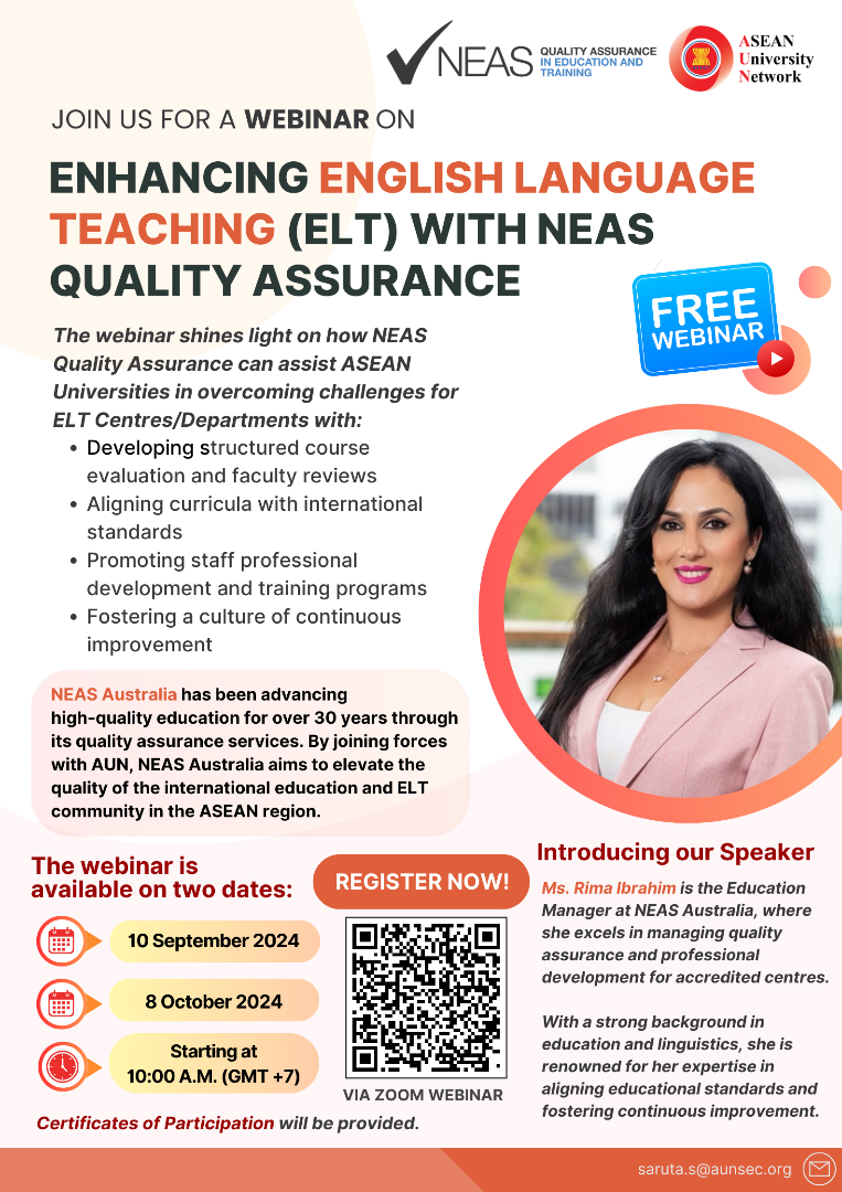 On September 10 and October 8, 2024, the ASEAN University Network (AUN), in collaboration with NEAS Australia, proudly presents an online webinar titled *”Enhancing ELT Standards with NEAS Quality Assurance.”* The webinar aims to assist ASEAN universities in improving their English Language Teaching (ELT) quality through NEAS’ structured quality assurance measures. About NEAS Australia NEAS Australia is a global leader in providing quality assurance services for English Language Teaching (ELT). Established over 30 years ago, NEAS has gained a solid reputation for assessing, developing, and improving the quality of English education across higher education, vocational education and training, high schools,...