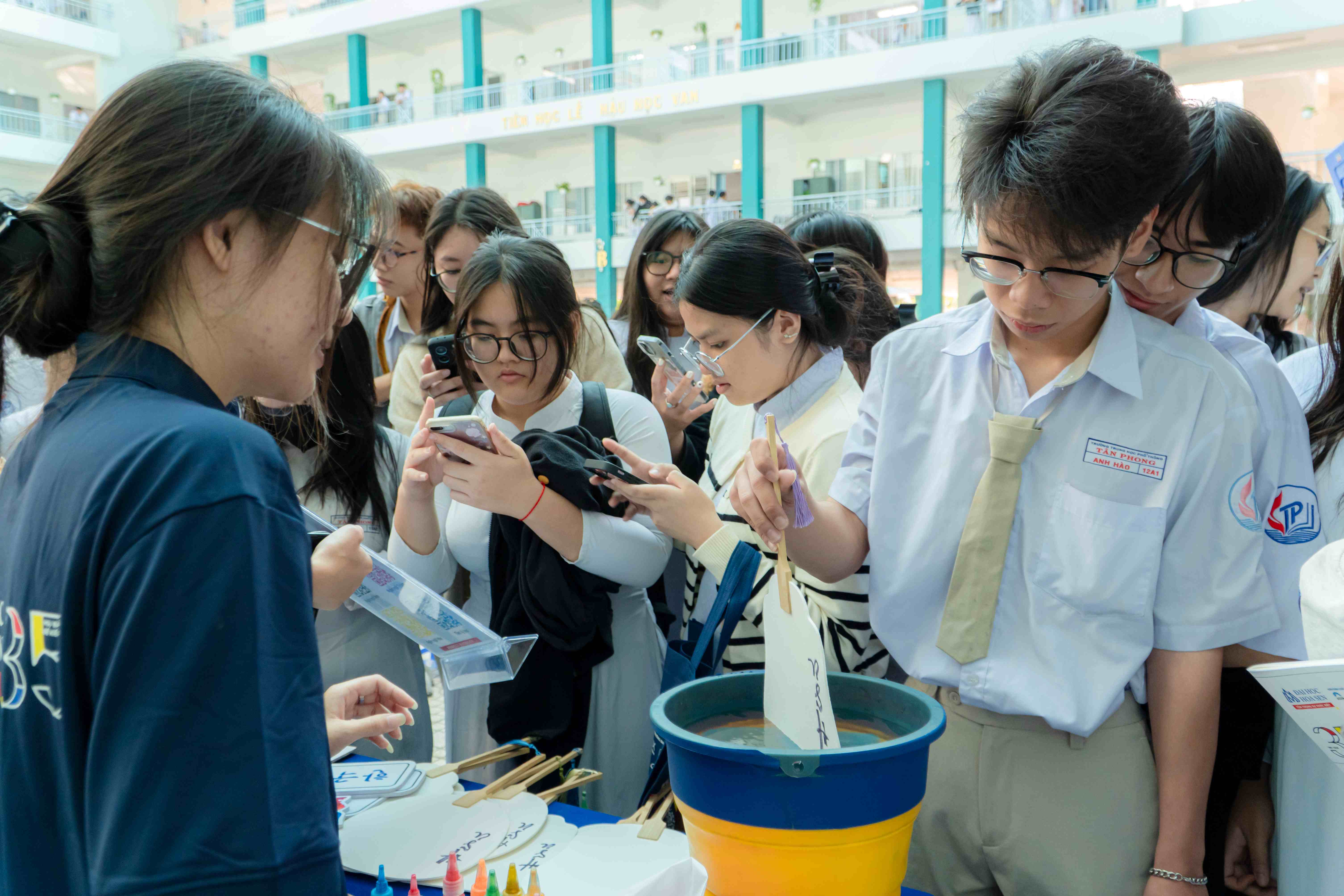 Ở khu vực gian hàng Khoa Ngôn ngữ – Tâm lý, các hoạt động thư pháp, vẽ tranh và tư vấn ngành học thu hút nhiều học sinh tham gia. Không gian mang đậm màu sắc văn hóa giúp các bạn vừa trải nghiệm vừa tìm hiểu về những ngành học gắn với con người và văn hóa.