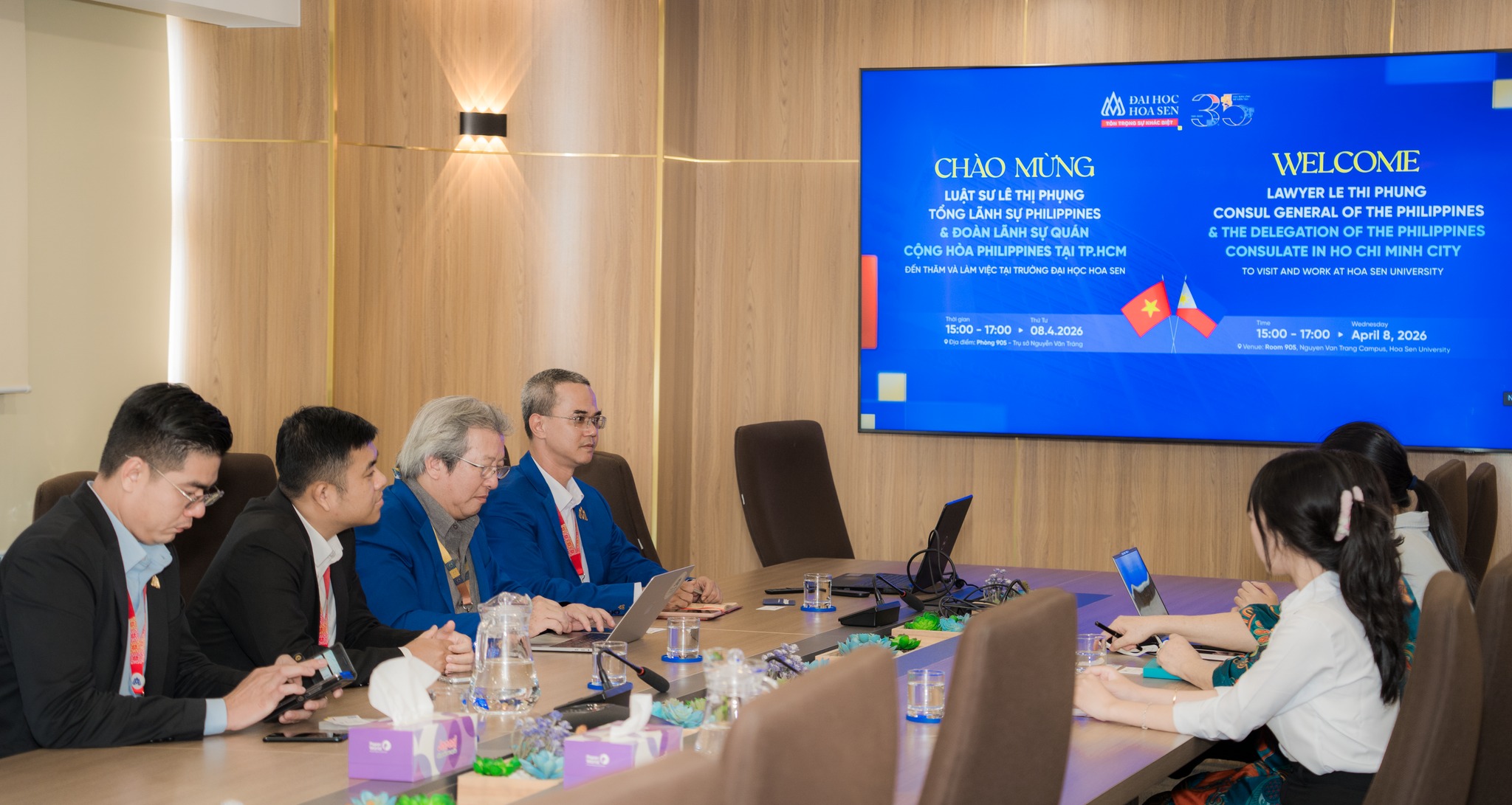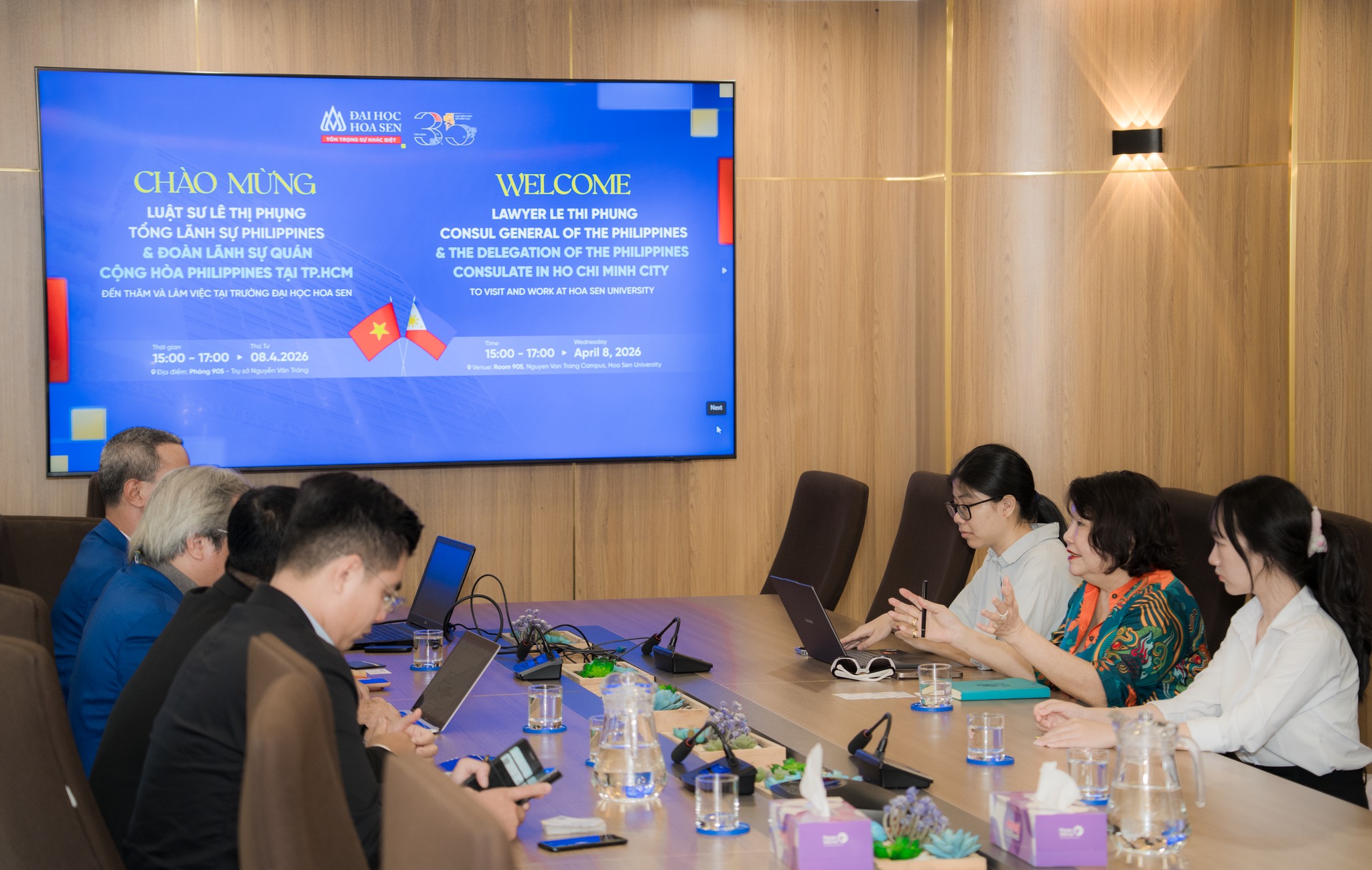 Chiều 8/4/2026, Đại học Hoa Sen (HSU) đã đón tiếp Luật sư Lê Thị Phụng – Tổng Lãnh sự danh dự Philippines tại TP.HCM đến thăm và làm việc. Buổi gặp gỡ là dịp để hai bên trao đổi về nhiều định hướng hợp tác thiết thực, hướng đến việc mở rộng mạng lưới kết nối quốc tế cho sinh viên và gia tăng cơ hội tiếp cận môi trường học tập, làm việc toàn cầu.