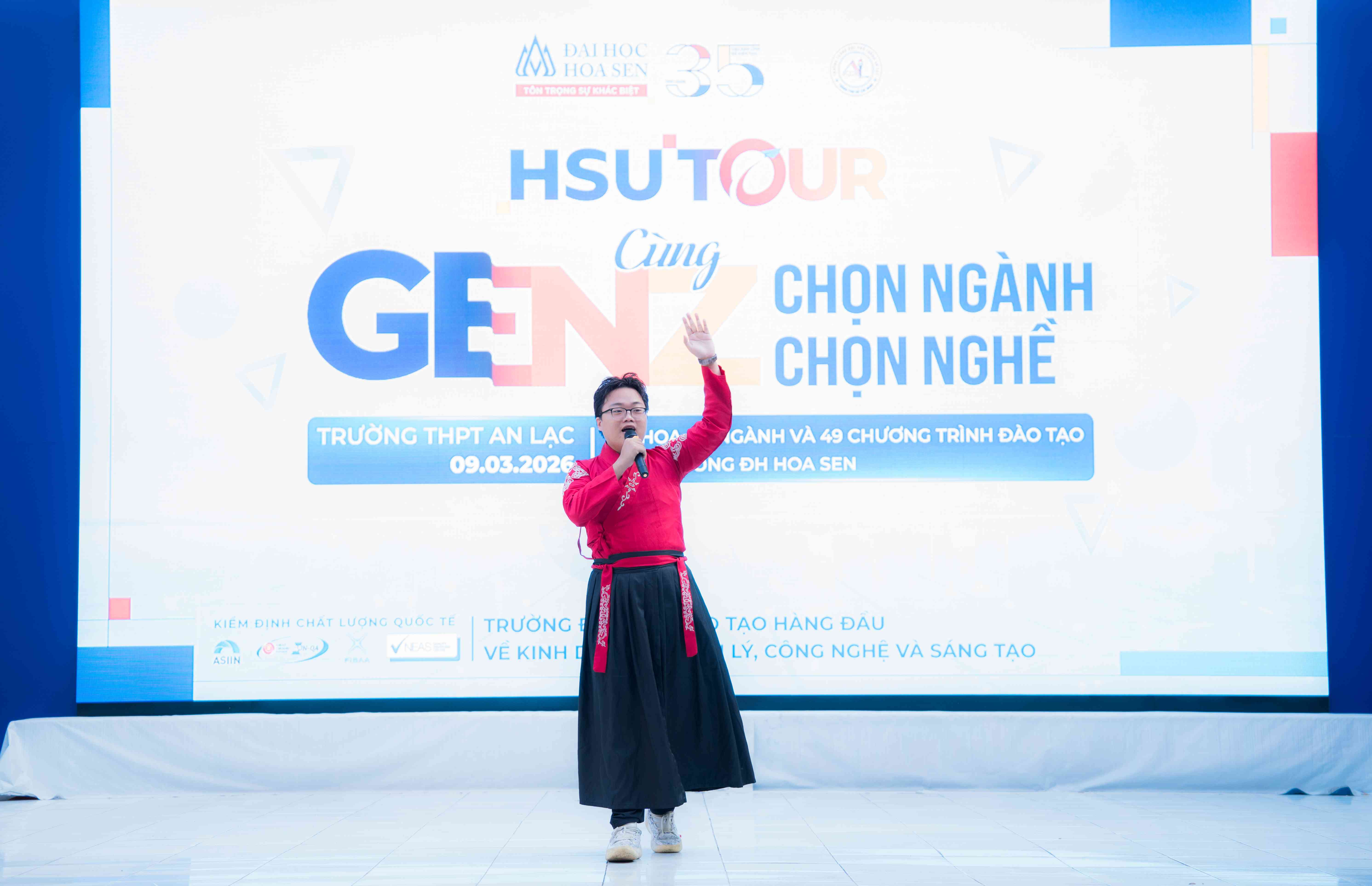 Trong khuôn khổ chương trình HSU Tour – Cùng GenZ chọn ngành, chọn nghề tại THPT An Lạc, các em học sinh đã có cơ hội lắng nghe những chia sẻ thiết thực về định hướng nghề nghiệp trước ngưỡng cửa đại học. Một trong những điểm nhấn của chương trình là phần giao lưu với chuyên gia truyền thông An Zuno – Giám đốc Truyền thông tại Yeah1 Group, người đứng sau chiến lược truyền thông của nhiều chương trình giải trí nổi bật như “Anh Trai Vượt Ngàn Chông Gai” và “Chị Đẹp Đạp Gió Rẽ Sóng”.