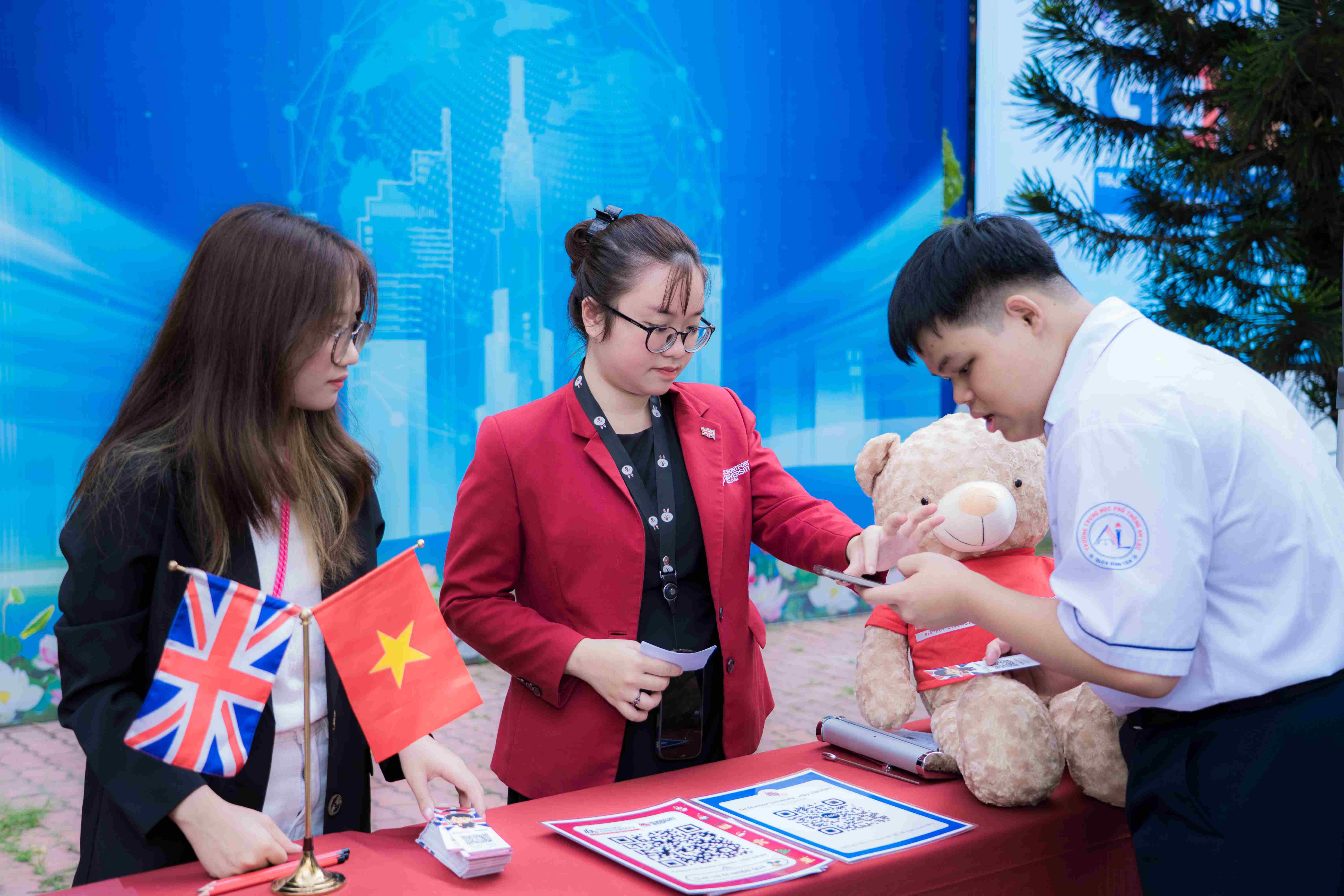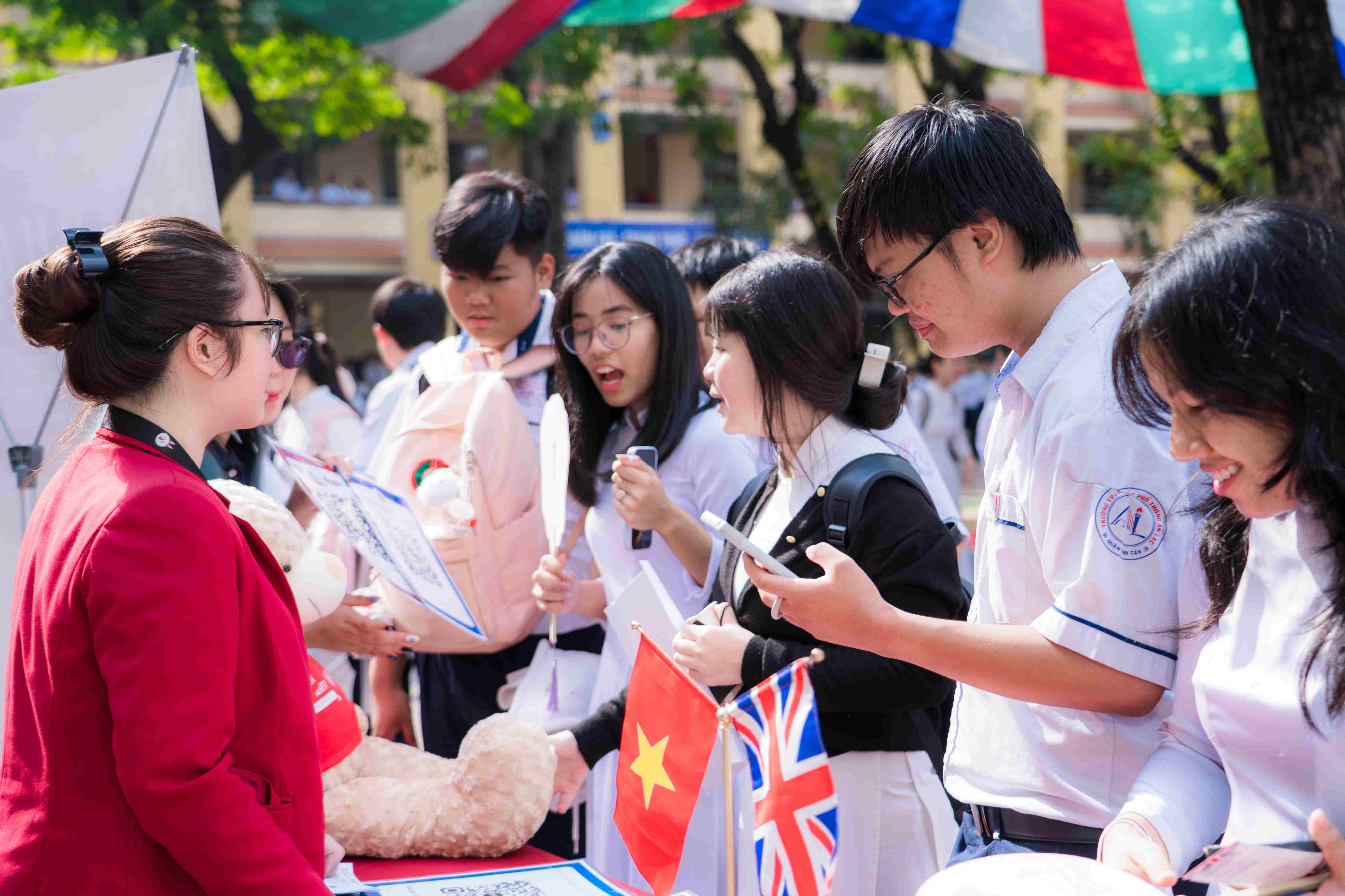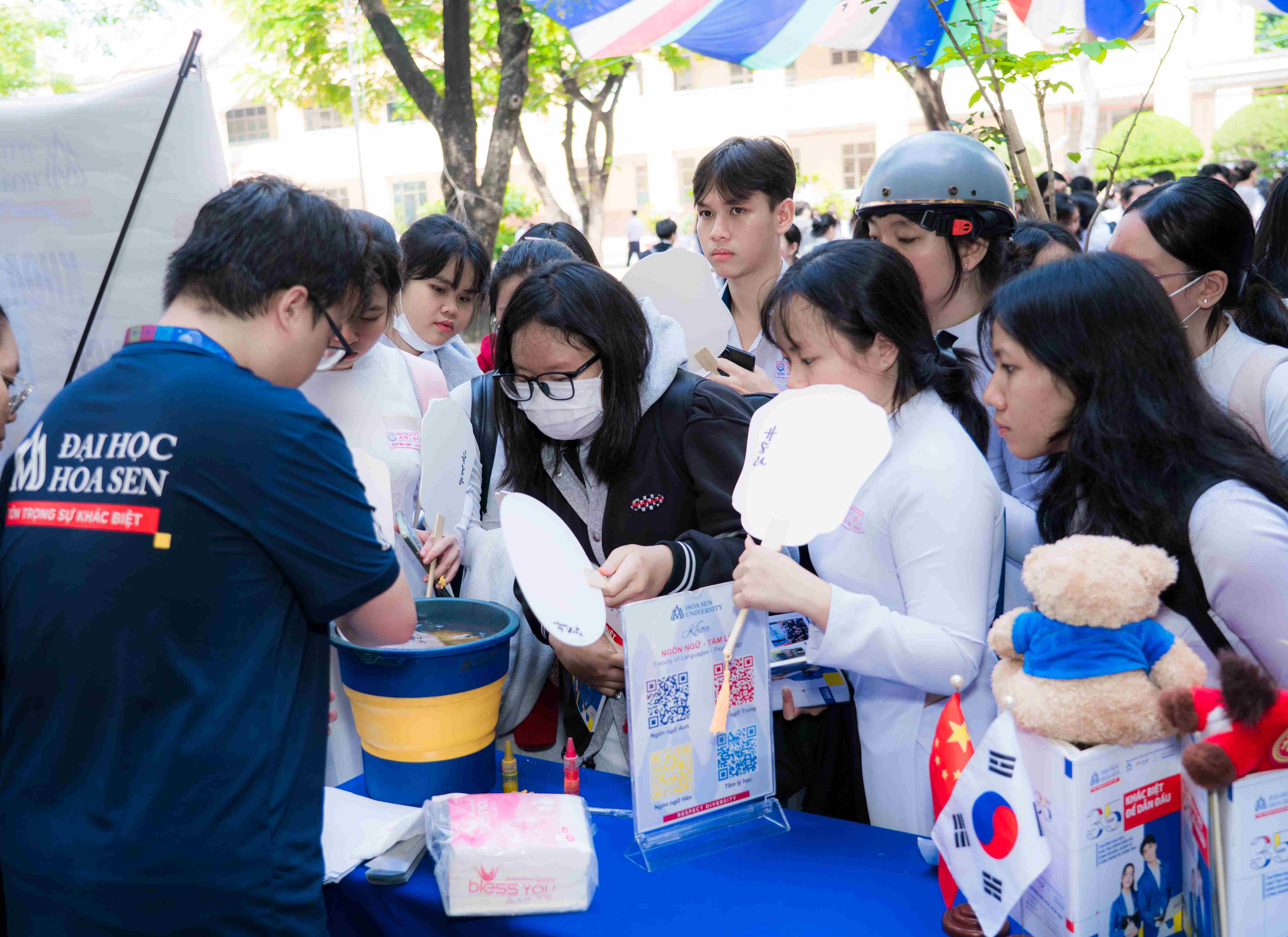Không khí chương trình trở nên gần gũi hơn khi sinh viên HSU giao lưu với học sinh bằng nhiều ngôn ngữ như tiếng Anh, tiếng Trung, tiếng Nhật, tiếng Hàn… Hoạt động nhỏ nhưng tạo nên sự thích thú cho các bạn học sinh, đồng thời thể hiện không khí của môi trường học tập theo tiêu chuẩn quốc tế và năng động tại HSU.