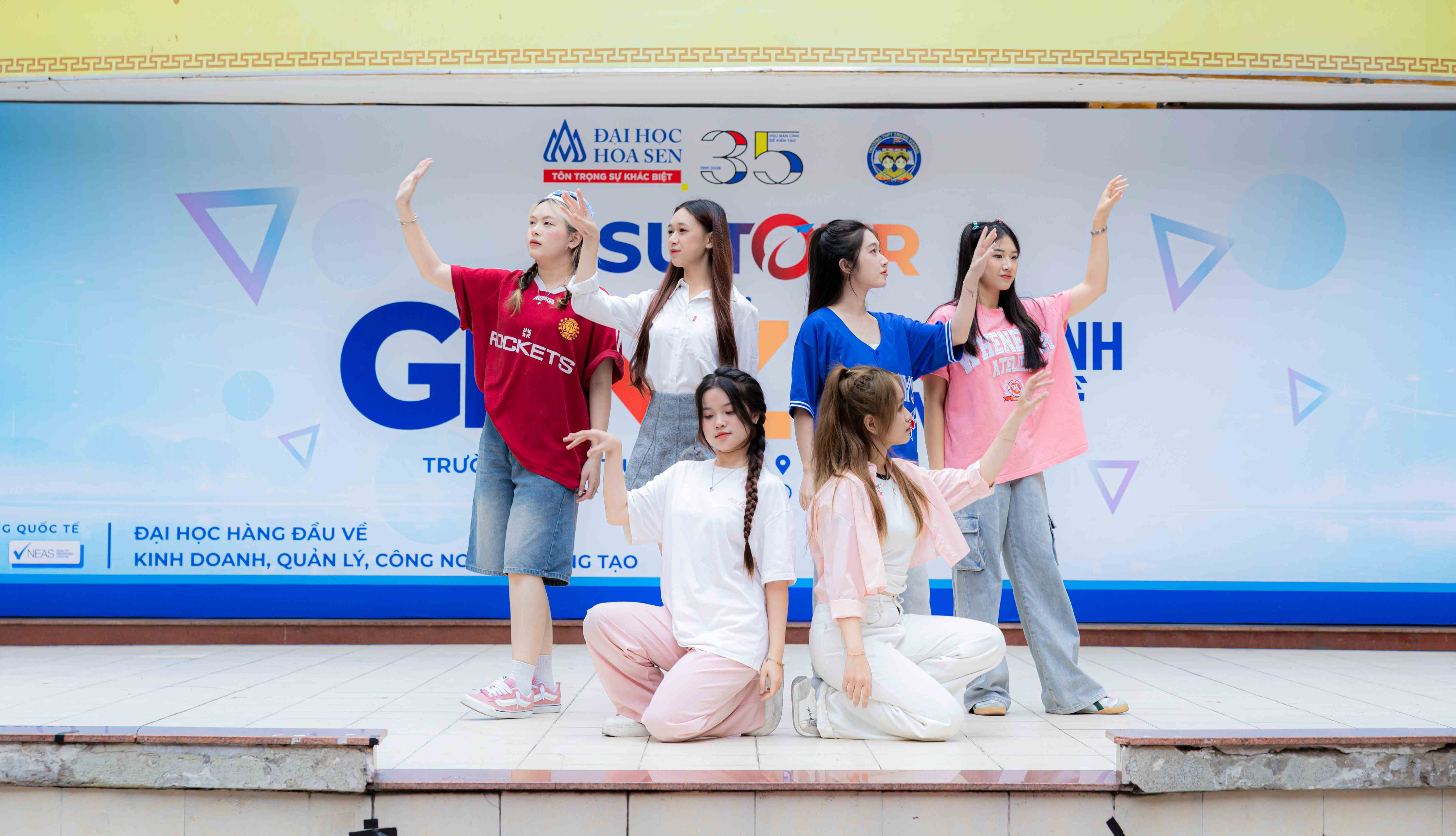 Không khí sân trường THPT Trưng Vương nhanh chóng được “đánh thức” bằng tiết mục nhảy mở màn sôi động đến từ đội Văn nghệ xung kích HSU. Những giai điệu trẻ trung đã khuấy động sân trường, tạo nên điểm chạm cảm xúc, giúp học sinh sẵn sàng bước vào hành trình khám phá bản thân, khám phá nghề nghiệp.
