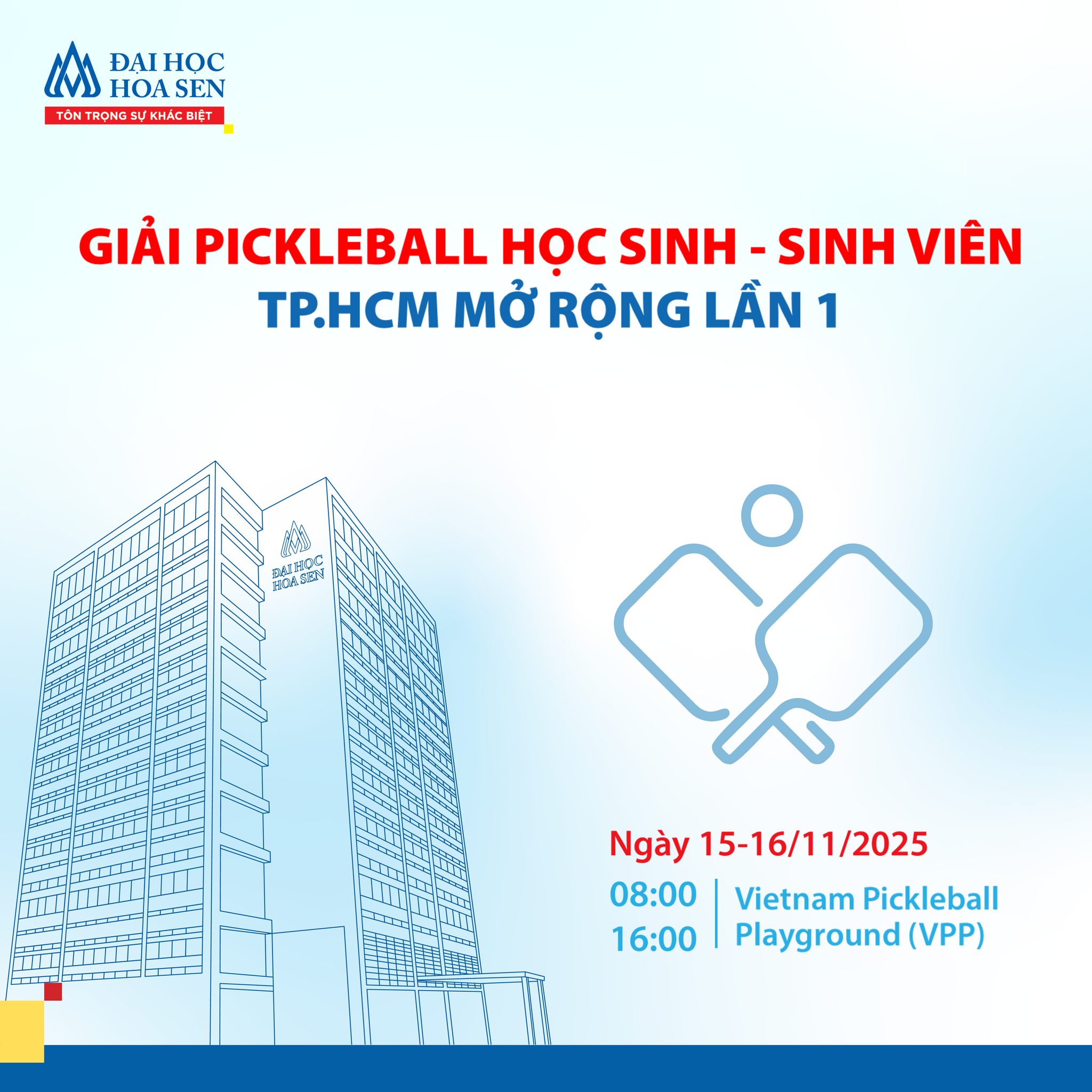 Giải đấu do Trung tâm Thể thao Đại học Hoa Sen phối hợp cùng Liên đoàn Quần vợt – Pickleball TP.HCM tổ chức, hướng đến mục tiêu xây dựng cộng đồng thể thao học đường năng động, gắn kết và phát triển bền vững.