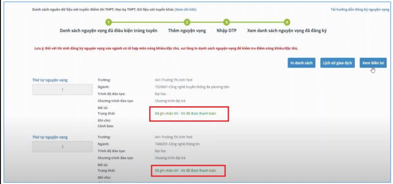 Khi nguyện vọng hiển thị trạng thái Đã ghi nhận NV – NV đã được thanh toán là quy trình đã hoàn thành (nếu trạng thái nguyện vọng chưa được ghi nhận, vui lòng nhấn Ctrl + F5 để Refresh màn hình).