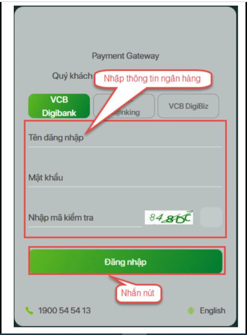 Bước 4: Nhập thông tin Tài khoản Vietcombank sau đó nhấn nút Đăng nhập