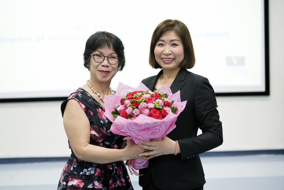 Tiến sĩ Phan Thị Thuỷ Tiên, Giám đốc Vatel Việt Nam tặng hoa cảm ơn Bà Võ Thị Tuyết Phương.