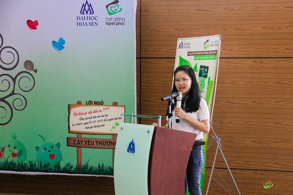 Cô Nguyễn Hoàng Chiêu Anh, trưởng Dự án Hạt giống Hạnh phúc phát biểu khai mạc buổi lễ