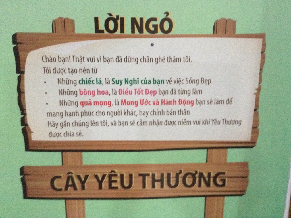 Một bạn giấu tên chia sẻ trên những cánh hoa được đính tại Cây yêu thương: “Khi có một cụ già hỏi đường, tôi không những chỉ đường đi mà còn chở cụ đến nơi cần đến. Điều đó khiến cụ rất vui và tôi cảm thấy vui vẻ”