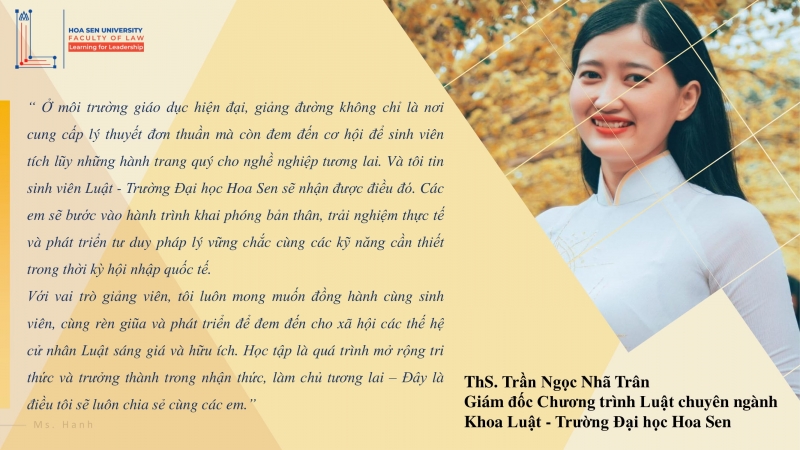 Her aspiration is “always wanting to accompany students, practice and develop together to bring to society generations of bright and useful Law graduates”.