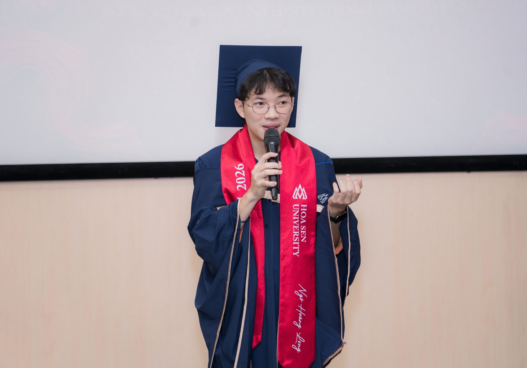 Khoảnh khắc xúc động và truyền cảm hứng nhất chính là sự xuất hiện của bạn Ngô Hoàng Long – Á khoa Ngành Luật Kinh tế K21. Trong bộ lễ phục Cử nhân cùng chiếc sash đỏ đặc trưng, Hoàng Long đã chia sẻ về hành trình từ một sinh viên nỗ lực đến khi trở thành nhân viên Cố vấn học tập của Khoa Luật. Câu chuyện của Long là minh chứng sống động nhất cho việc: Tại HSU, sự nỗ lực luôn được đền đáp bằng những cơ hội nghề nghiệp xứng đáng.
