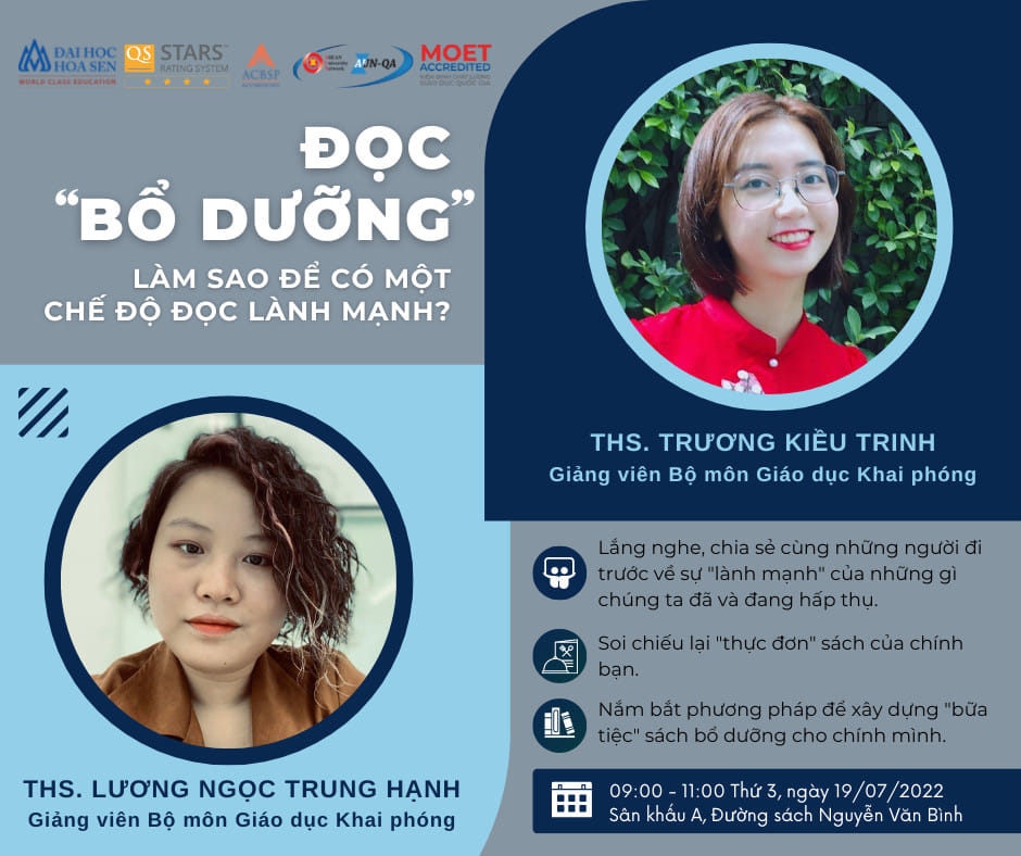 Tiếp nối sự thành công từ talkshow “Đọc sách khai phóng” được tổ chức tại đường sách Nguyễn Văn Bình ngày 16/7/2022. Khoa Khoa học xã hội mang đến cho những ai có niềm đam mê đọc sách buổi chia sẻ với chủ đề: Đọc “bổ dưỡng” – Làm sao để có một chế độ đọc lành mạnh.
