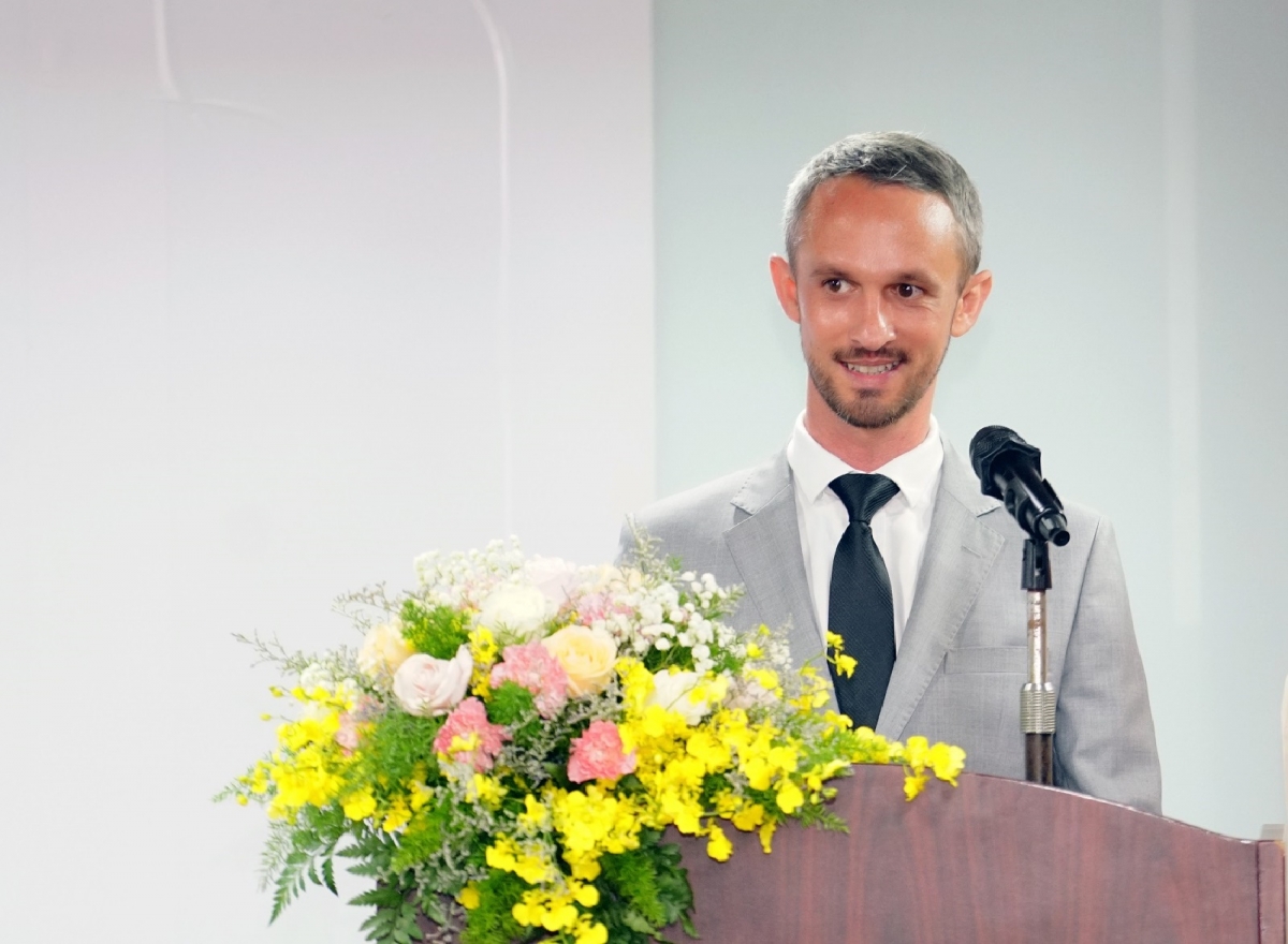 Phó tổng lãnh sự Hungary tại TP.HCM, ông Rostás Gábor cũng gửi lời chúc mừng nồng nhiệt đến Ban lãnh đạo trường Đại Học Hoa Sen cùng toàn thể Giảng viên, nhân viên ngành Luật nhân sự kiện trang trọng này. Ông Rostás Gábor cũng khẳng định tin tưởng sự phát triển của chương trình Luật dưới thương hiệu trường Đại học Hoa Sen sẽ ghi dấu ấn trong quan hệ hợp tác song phương tốt đẹp giữa 2 nước Việt Nam – Hungary vốn có truyền thống hơn 70 năm. Ngài Phó Lãnh sự mong muốn làm cầu nối và thúc đẩy nhiều hơn các hợp tác về giáo dục – đào tạo giữa Đại học Hoa Sen và các trường Đại học Hungary.