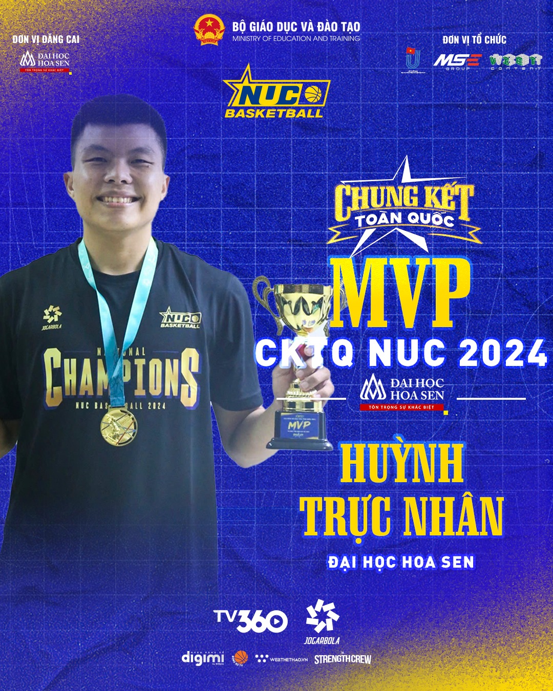 Thủ lĩnh Huỳnh Trực Nhân mang 𝘀𝗼̂́ 𝗮́𝗼 𝟰𝟳 thuộc ngành Quản trị Kinh doanh, sau chấn thương trong giải đấu, bạn đã cùng đồng đội đánh bại đối thủ đáng gờm UEB với tỷ số 69-60. MVP Nam chung kết toàn quốc NUC 2024 gọi tên Huỳnh Trực Nhân với màn thể hiện vô cùng cháy cũng như tinh thần thi đấu của chiến binh giúp cho Đại Học Hoa Sen bước lên ngôi vương toàn quốc NUC 2024 chính là những minh chứng đanh thép cho danh hiệu MVP này.