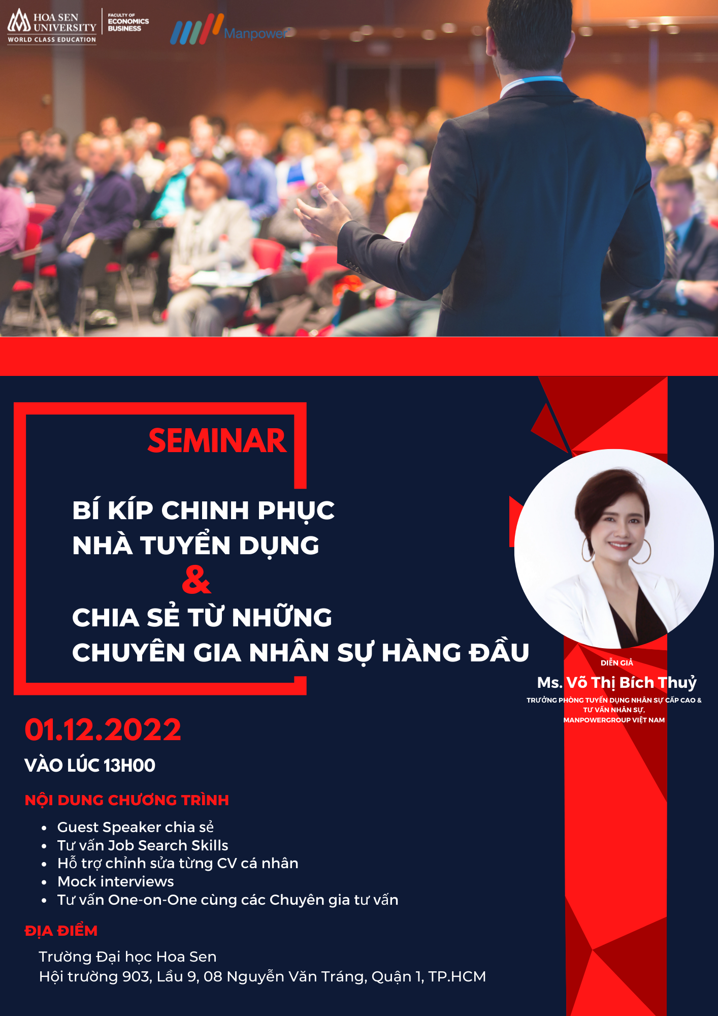 Thấu hiểu được tâm lý đó của các bạn sinh viên, ngành Quản trị Nhân lực phối hợp cùng Manpower Group Vietnam tổ chức buổi seminar: