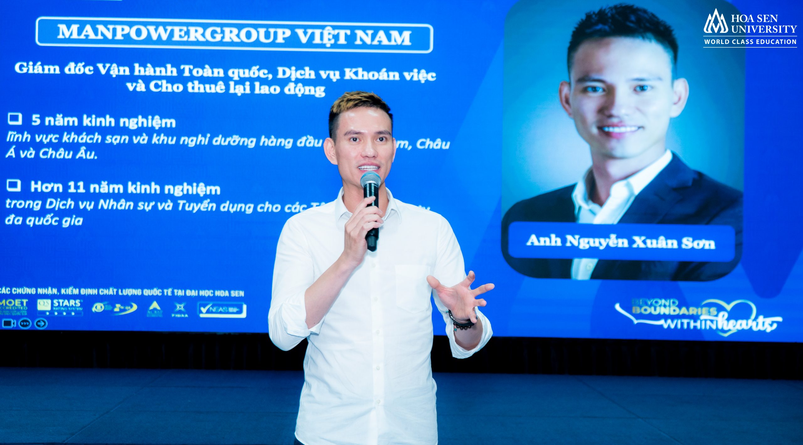 Regarding the Opening Session for the Business Management and Human Resource Management majors, it was an honor to have the presence of esteemed businesses, including Mr. Nguyen Xuan Son – Nationwide Operations Director for Outsourcing and Labor Leasing Services at ManpowerGroup Vietnam. He shared motivational insights on studying, career orientation, and job opportunities with the students.