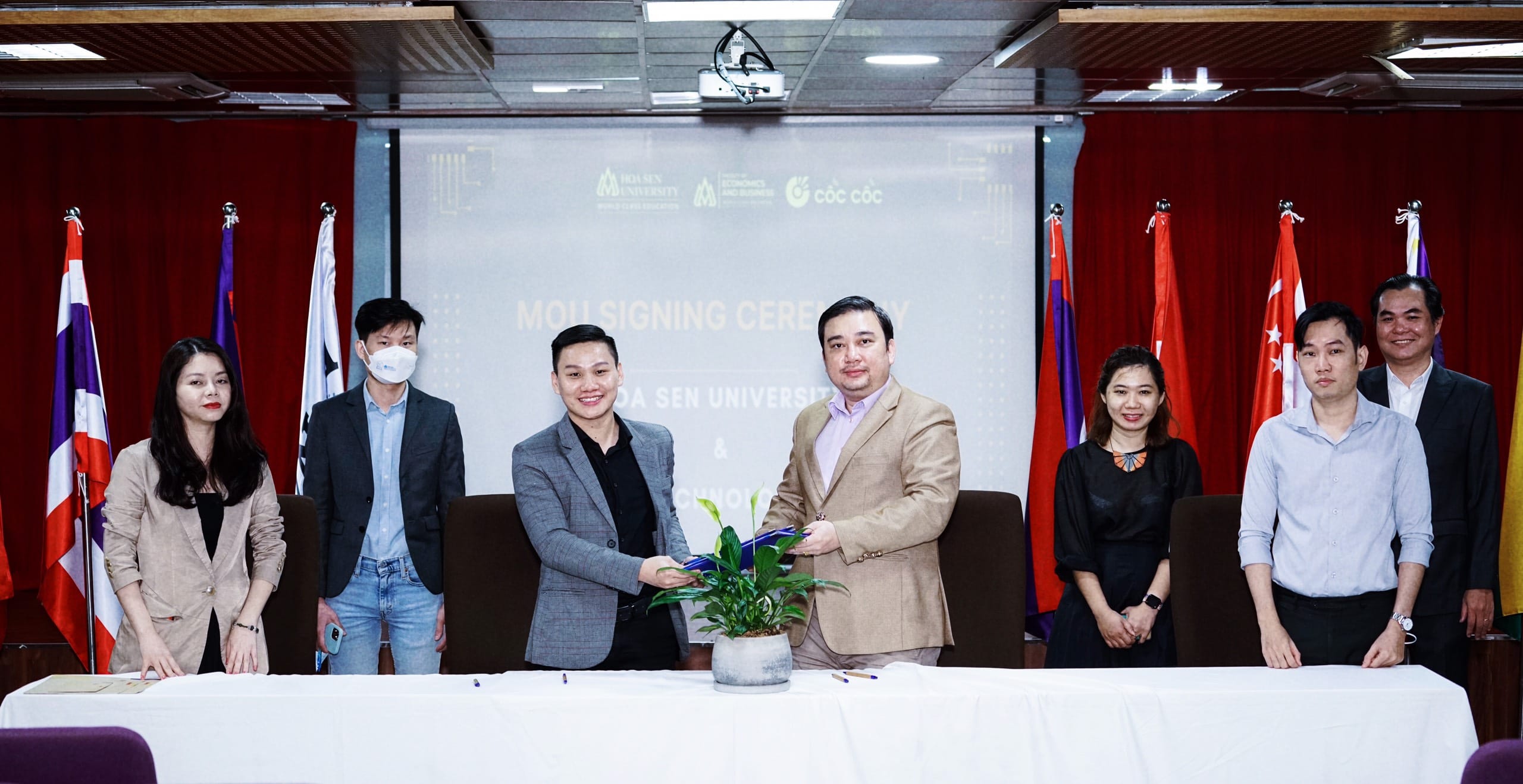 Tham gia lễ ký kết, đại diện phía Trường đại học Hoa Sen gồm TS. Nguyễn Hữu Hảo (Trưởng khoa Khoa Kinh tế & Quản trị), TS. Phan Võ Minh Thắng (Giám đốc chương trình ngành Quản trị kinh doanh) và ThS. Nguyễn Vũ Diệu Linh (Giám đốc chương trình ngành Digital Marketing & Hoa Sen Plus). Về phía Cốc Cốc gồm anh Ngô Thành Đại (EB & IB Team Leader) và chị Đoàn Thị Thuỷ Tiên (HRBP Supervisor).