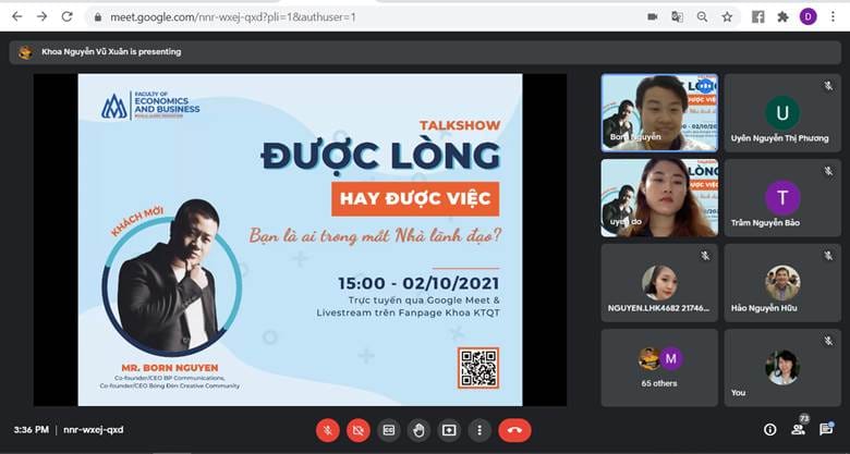 Vừa qua, vào ngày 02/10/2021, Ngành Quản trị Nhân lực đã tổ chức buổi Talkshow “Được lòng hay được việc? – Bạn là ai trong mắt nhà lãnh đạo” với sự tham gia của gần 100 người tham dự trên cả Google Meet và Livestream trên Fanpage Khoa KTQT.