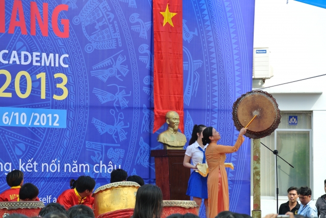 TS Bùi Trân Phượng -Hiệu trưởng Trường ĐH Hoa Sen đánh trống khai giảng năm học mới