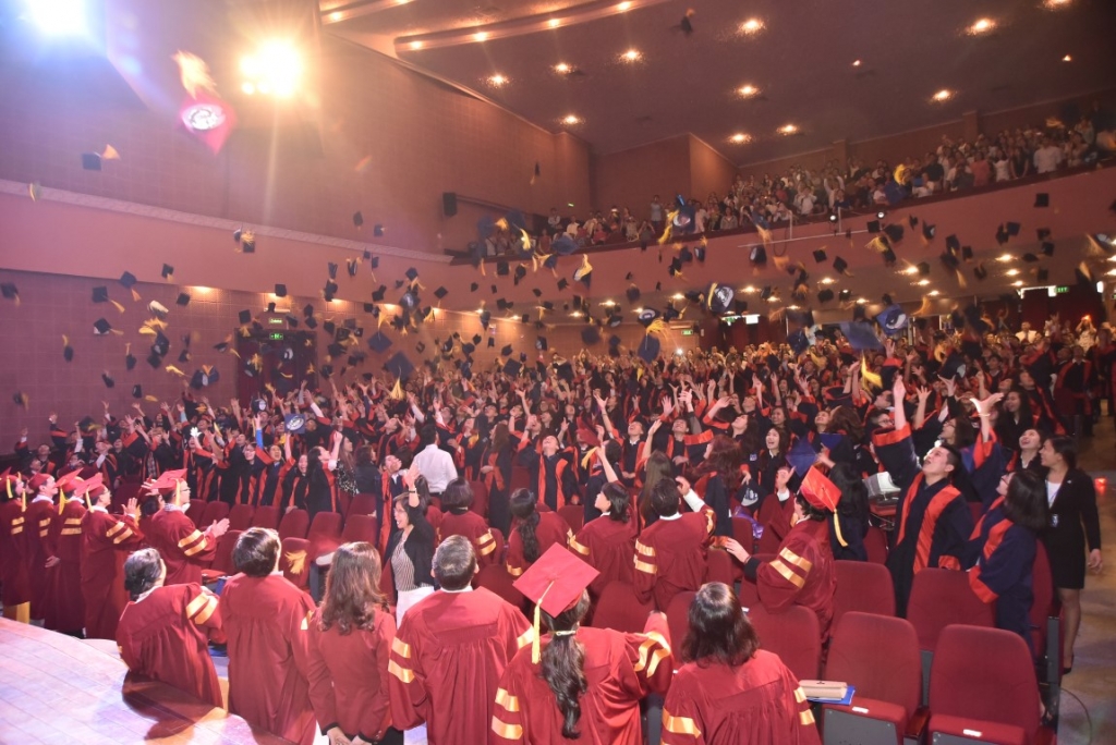 Kết thúc buổi lễ, đông đảo tân khoa, thầy cô, quan khách, phụ huynh cùng đứng lên và hoà chung không khí đặc biệt của nghi thức tung nón.