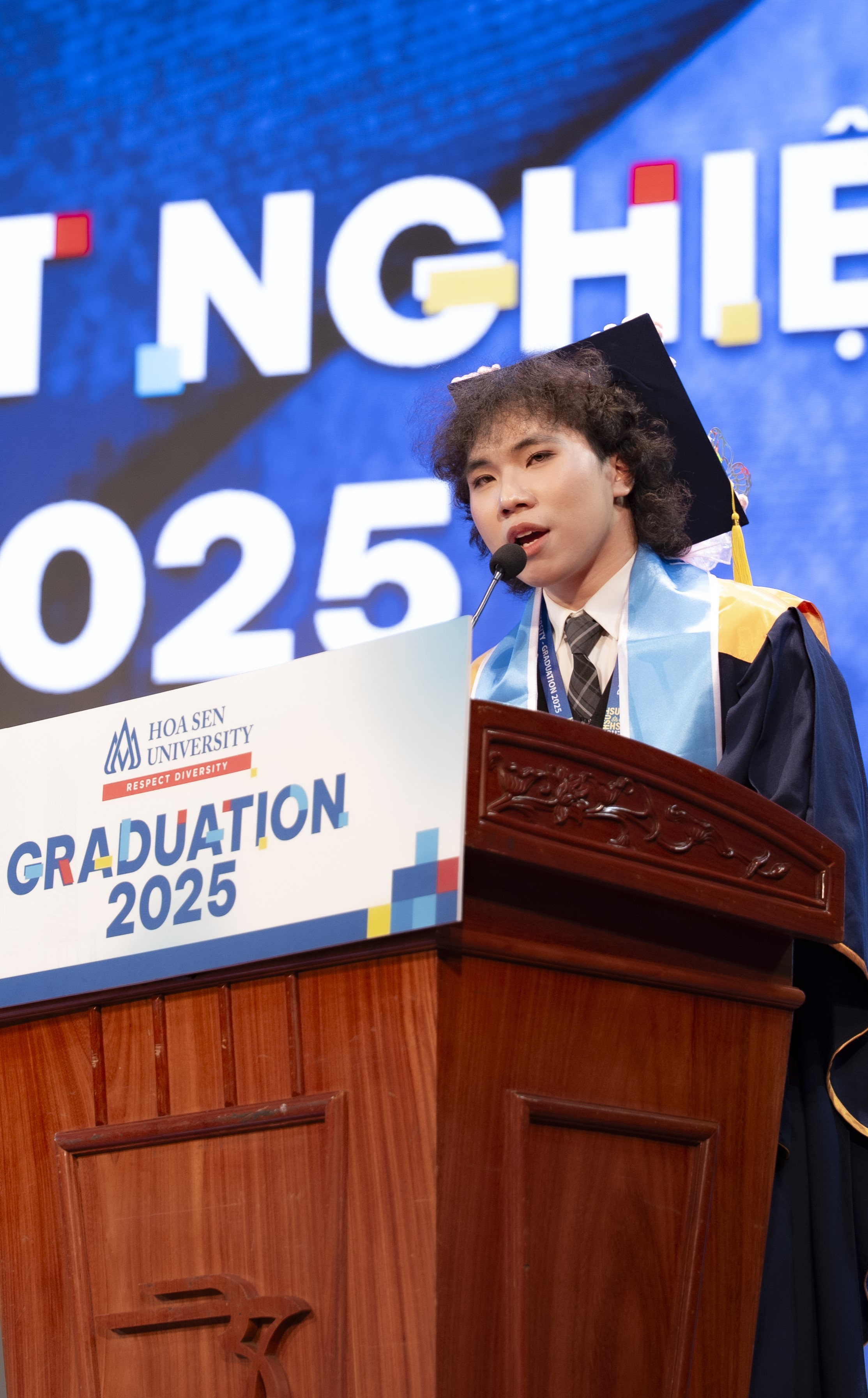 Em vô cùng biết ơn Thầy Cô đã truyền đạt kiến thức và giá trị sống cho chúng em trong suốt những năm qua, dạy cho tụi em cách trở thành một người tử tế và đầy bản lĩnh. Và cũng dưới mái trường này, em có cơ hội gặp gỡ những người bạn tưởng chừng xa lạ nhưng rồi lại trở thành một phần quan trọng trong hành trình đại học. Những điều nhỏ bé ấy khiến em hiểu rằng: Đại học không chỉ là nơi học kiến thức, mà còn là nơi học cách biết ơn những người đã đồng hành.