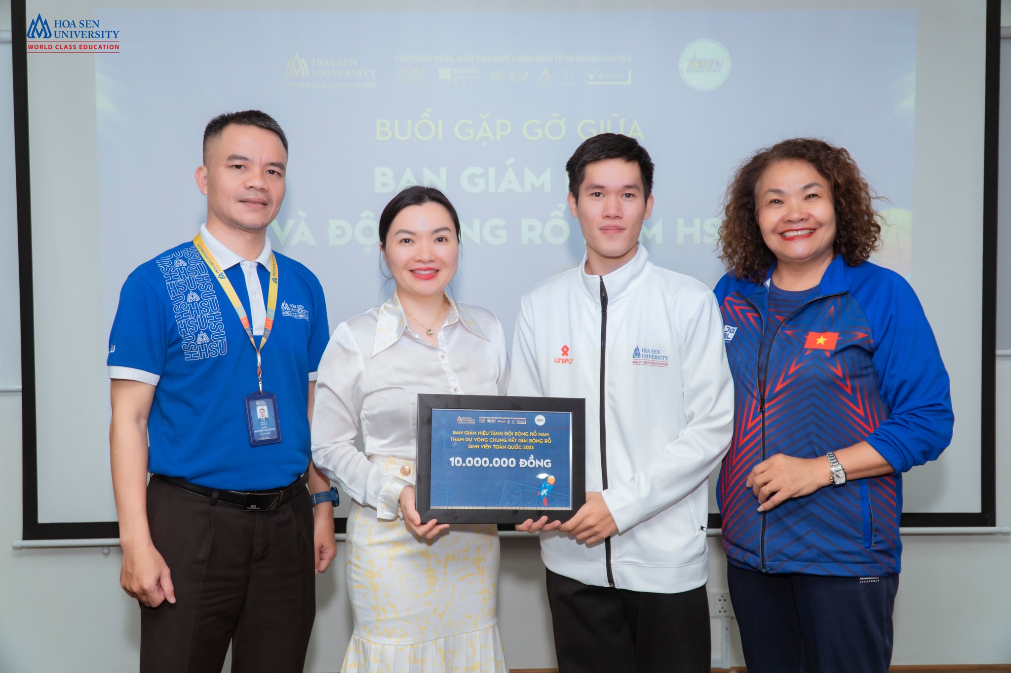 Bạn Nguyễn Đức Long – Sinh viên ngành Kinh doanh Quốc tế, Đội trưởng đội bóng rổ đã gửi hoa tri ân BGH Nhà trường, đồng thời gửi lời cảm ơn và bày tỏ quyết tâm thi đấu hết mình vì màu cờ sắc áo của HSU.