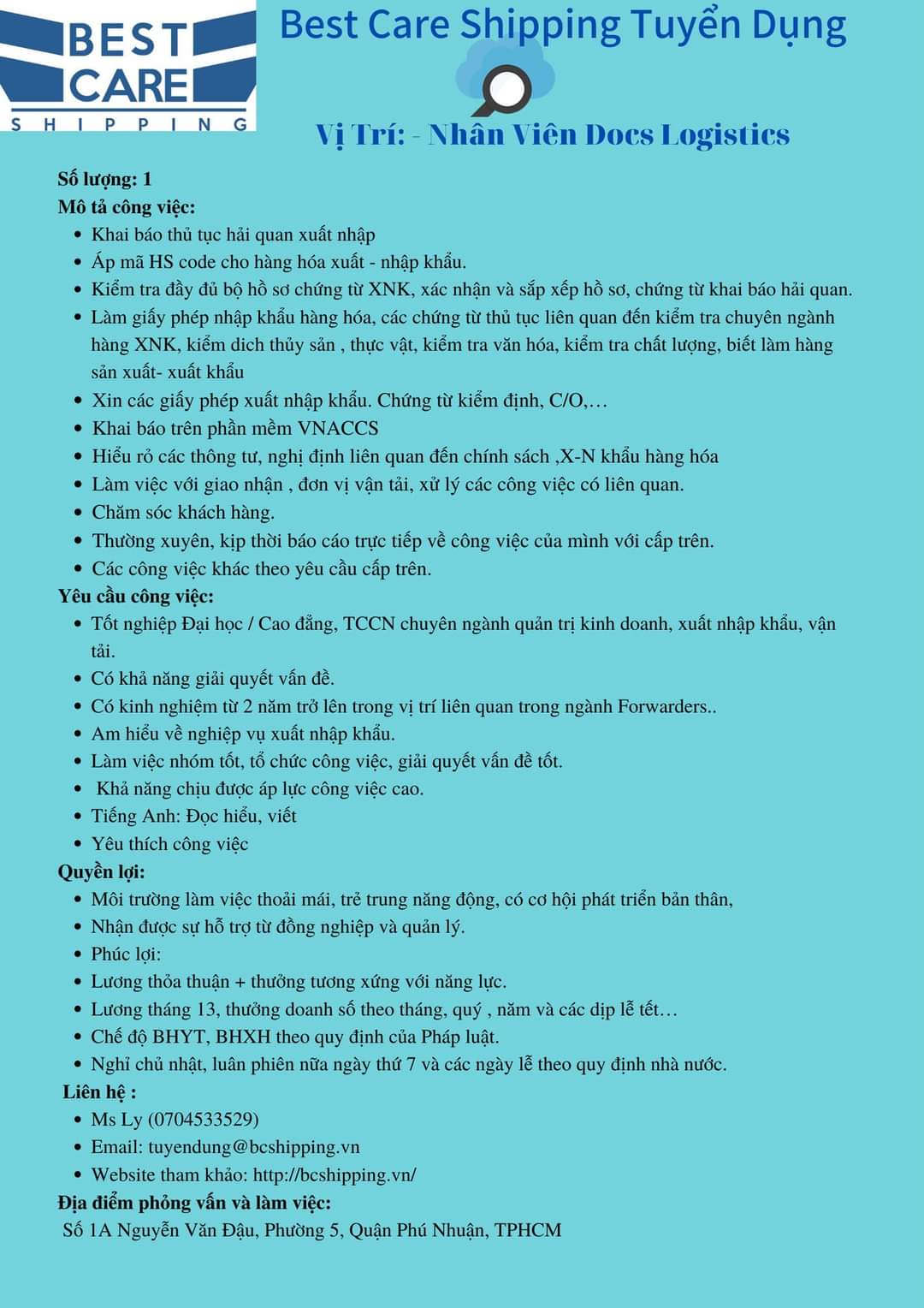 Liên hệ chi tiết công việc qua Email: tuyendung@bcshipping.vn – 0704533529 (Ms Ly)