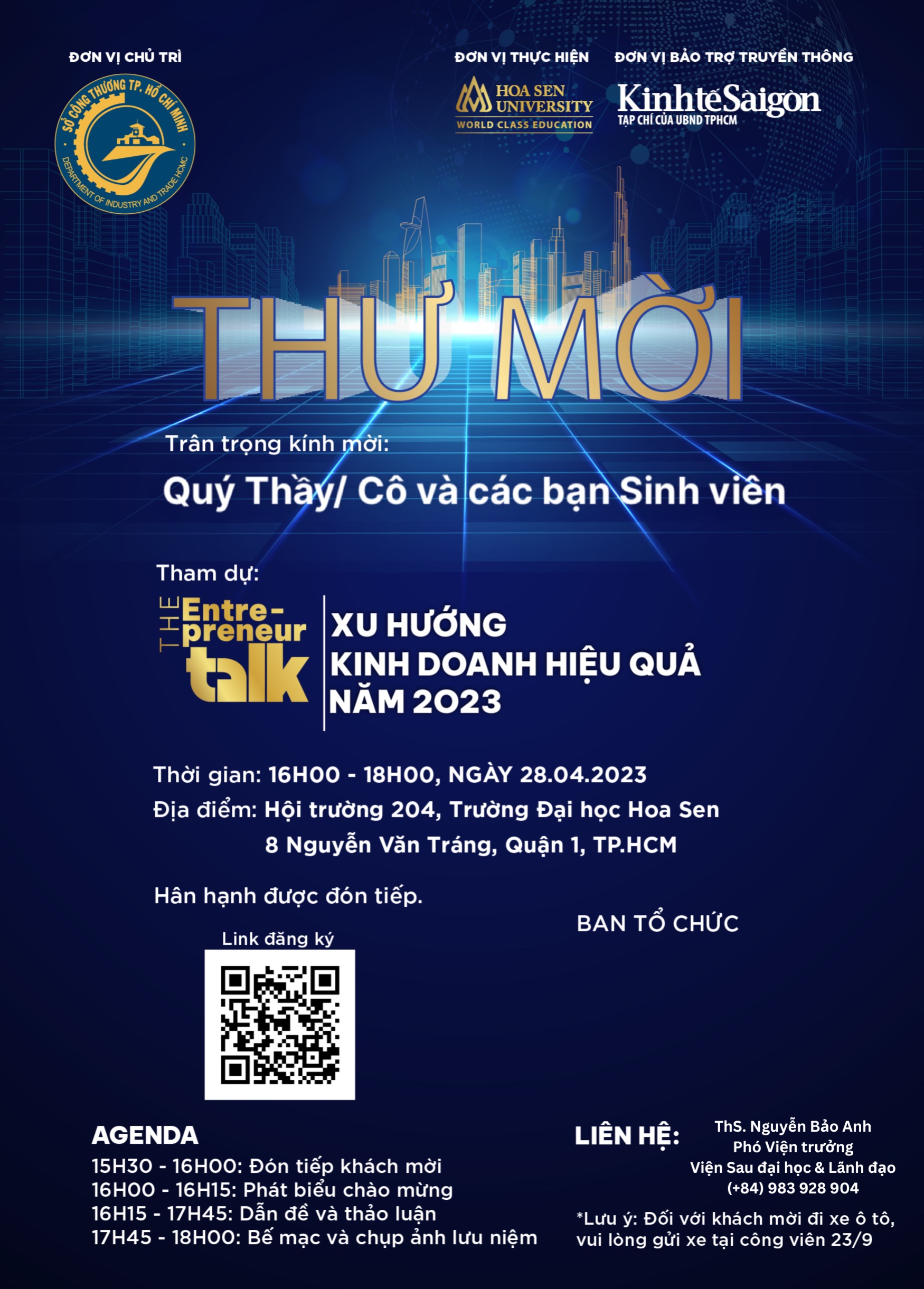 Chương trình Hội thảo The Entrepreneur Talk 2023 Tập 1 – Xu hướng kinh doanh hiệu quả 2023 do Đại học Hoa Sen đã phối hợp với Sở Công thương và Tạp chí Kinh tế Sài Gòn tổ chức. Đây là nơi các Diễn giả chia sẻ về quá trình phát triển của doanh nghiệp, những khó khăn mà doanh nghiệp đã vượt qua và những cột mốc đáng nhớ. Bên cạnh đó, các Diễn giả sẽ tiết lộ những yếu tố giúp doanh nghiệp đã đạt được giải thưởng Thương hiệu vàng và những kế hoạch tương lai để bản thân doanh nghiệp đối đầu với những khó khăn sắp tới.