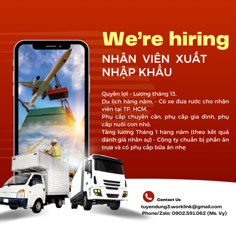 TUYỂN NHÂN VIÊN XUẤT NHẬP KHẨUNơi làm việc: KCN Long Hậu – Long AnMức lương: 10 – 15 triệuMô tả công việc: