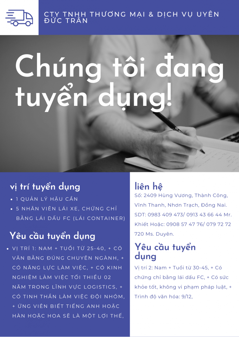 Do nhu cầu mở rộng, Cty chúng tôi cần tuyển dụng những vị trí làm việc tại Nhơn Trạch như sau:A. Số lượng và ngành nghề B. Yêu cầu tuyển dụng D. Hồ sơ dự tuyển gồm E. Liên hệ và gửi hồ sơVP Cty TNHH Thương Mại & Dịch Vụ Uyên Đức TrânSố: 2409 Hùng Vương, Thành Công, Vĩnh Thanh, Nhơn Trạch, Đồng Nai.SDT: 0983 409 473/ 0913 43 66 44 Mr. KhiếtHoặc: 0908 57 47 76/ 079 72 72 720 Ms. Duyên.