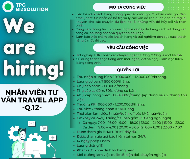 Bạn đang là sinh viên năng động, nhiệt huyết và mong muốn có cơ hội trau dồi kỹ năng tư vấn, giao tiếp? Bạn đam mê hỗ trợ, giải đáp thắc mắc và mang đến những trải nghiệm tuyệt vời cho khách hàng? Bạn đam mê hỗ trợ, giải đáp thắc mắc và mang đến những trải nghiệm tuyệt vời cho khách hàng? TPC-BIZSOLUTION cần tuyển nhân viên tư vấn Travel App _Q.12 Mô tả công việc:  Yêu cầu công việc: Quyền lợi: ——————————————————— THÔNG TIN ỨNG TUYỂN #HSU #FLIT #Tuyendung