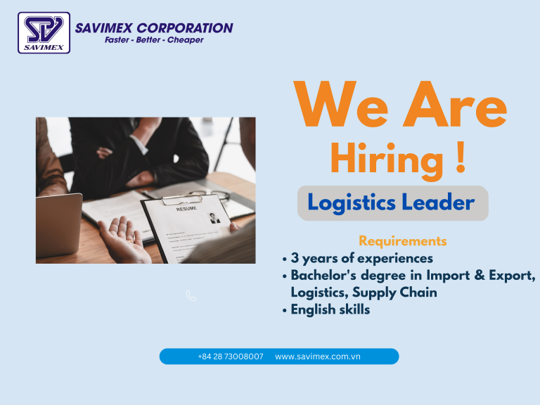 Position : Logistics Leader – HCM Job Description Manage end-to-end logistics solutions to achieve the required on-time delivery of goods. Manage logistics costs to meet budgets. Details:1. Responsible for the customs settlement report yearly: 2. Handling customs activity related to import, export, re-export, re-purpose, and scrap/disposal… Requirements: Working time: Mon – Fri (7:30 – 16:30) Benefits: Location: 162 HT17, Hiep Thanh ward, District 12, HCMC Other information: Contact : + Tel : +84 28 73008007 + Email: info@savimex.com