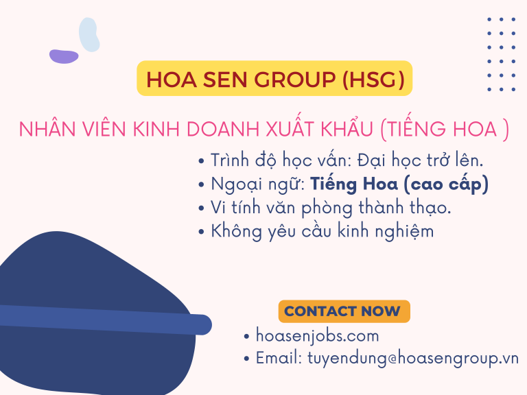 Vị trí : Nhân Viên Kinh Doanh Xuất Nhập Khẩu ( Tiếng Hoa ) Mô tả Công việc 1. Bán hàng 2. Chăm sóc khách hàng 3. Nghiệp vụ – Quy trình Xuất Khẩu Yêu Cầu Công Việc 1. Trình độ 2. Kinh nghiệm: Không yêu cầu kinh nghiệm sẽ được đào tạo, ưu tiên ứng viên có định hướng theo mảng kinh doanh xuất khẩu. 3. Kỹ năng:  4. Các yêu cầu khác: Thông tin liên hệ: Phòng Tuyển dụng Tập đoàn Hoa Sen Mọi thắc mắc Quý Anh/Chị vui lòng liên hệ Phòng Tuyển dụng để được trao đổi chi tiết...