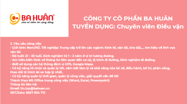 Vị trí: Sales Logistics Mô tả Công việc * Thời gian làm việc: Thứ 2 – Sáng Thứ 7 (Sáng: 08h30 – 12h00; Chiều: 13h00 – 17h30) * Địa điểm làm việc: King Building, Số 7 Chùa Bộc, Quận Đống Đa, Hà Nội ====================================== * Working Hours: Mon – Fri (08:00 – 12:00; 13:30 – 17:30), Sat (08:00 – 12:00) * Location: King Building, No. 7 Chua Boc, Dong Da Dist., Hanoi City Yêu Cầu Công Việc Yêu cầu công việc: Quyền lợi: ====================================== Requirements: Benefit: Thông tin khác Liên hệ Điện thoại: +84-28-38267312 Fax: +84-28-38267313 WEBSITE: www.vantage-logistics.com.vn EMAIL: info@vlc.com.vn