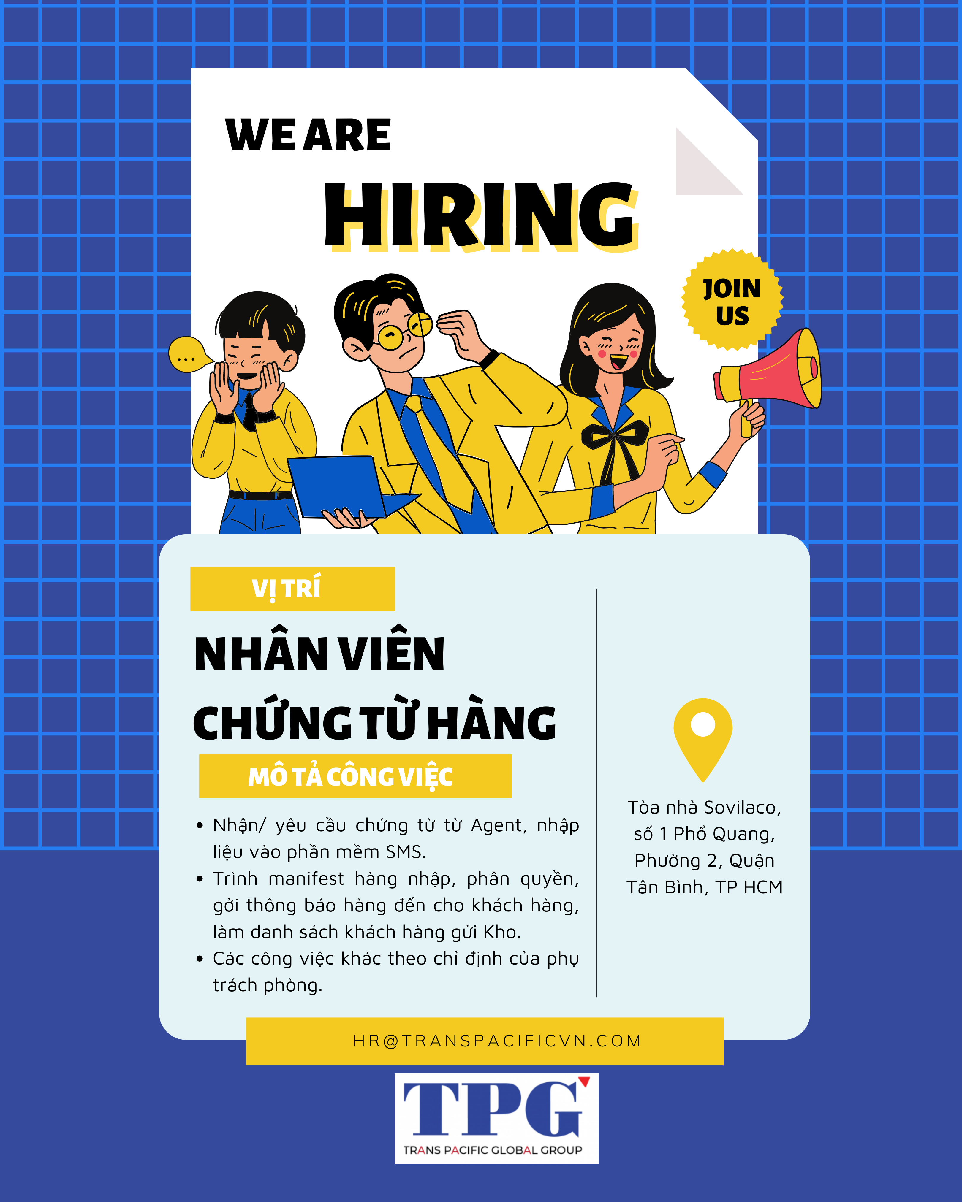 NHÂN VIÊN CHỨNG TỪ HÀNG Địa chỉ làm việc: Tòa nhà Sovilaco, Số 1 Phổ Quang, Phường 2, Quận Tân Bình, TPHCM. Mô tả công việc: Nhận/ yêu cầu chứng từ từ Agent, nhập liệu vào phần mềm SMS Trình manifest hàng nhập, phân quyền, gởi thông báo hàng đến cho khách hàng, làm danh sách khách hàng gửi Kho Các công việc khác theo chỉ định của phụ trách phòng Yêu cầu công việc Tốt nghiệp: Cao Đẳng, Đại Học Có ít nhất 1 năm kinh nghiệm vị trí liên quan. Tiếng Anh thành thạo Thành thạo Word, Excel,...