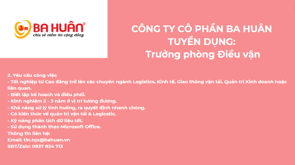 CÔNG TY CỔ PHẦN BA HUÂN TUYỂN DỤNG TRƯỞNG PHÒNG ĐIỀU VẬN