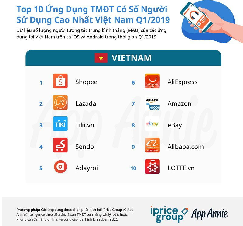 iPrice’s report ranks the most used e-commerce applications in 2019, in which the top 4 are Shopee, Lazada, Tiki and Sendo (familiar names that remain the same throughout the year, despite the competition). competition from foreign applications that have just appeared and been downloaded a lot), showing high consumer loyalty to e-commerce applications.