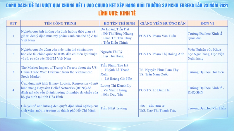 Hoa Sen University has 3 topics that passed the Final Round 1 and continued to enter the Final Ranking in the fields of: Architecture and Construction Planning (01); Education (01); Economics (02). Both topics in the field of Economics that entered the final round of the Euréka award are students of the Faculty of Logistics and International Trade. Hope you continue to get good results in the next round.