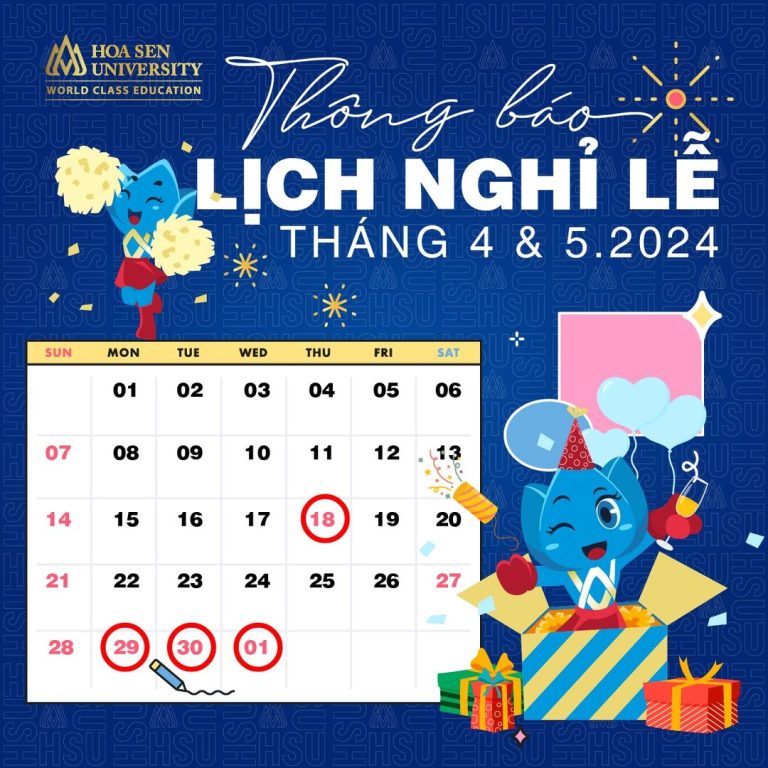 Although the Lunar New Year has passed, the April holiday season is here! Hoa Sen University would like to announce the holiday schedule to all students, lecturers, and staff as follows: + Lecturers and staff will make up for the missed work on May 4th, 2024 (Saturday).+ Students should follow the class schedule and carry out their studies accordingly. –We wish all lecturers, staff, and students a joyful, safe, and happy holiday with their families and loved ones!–