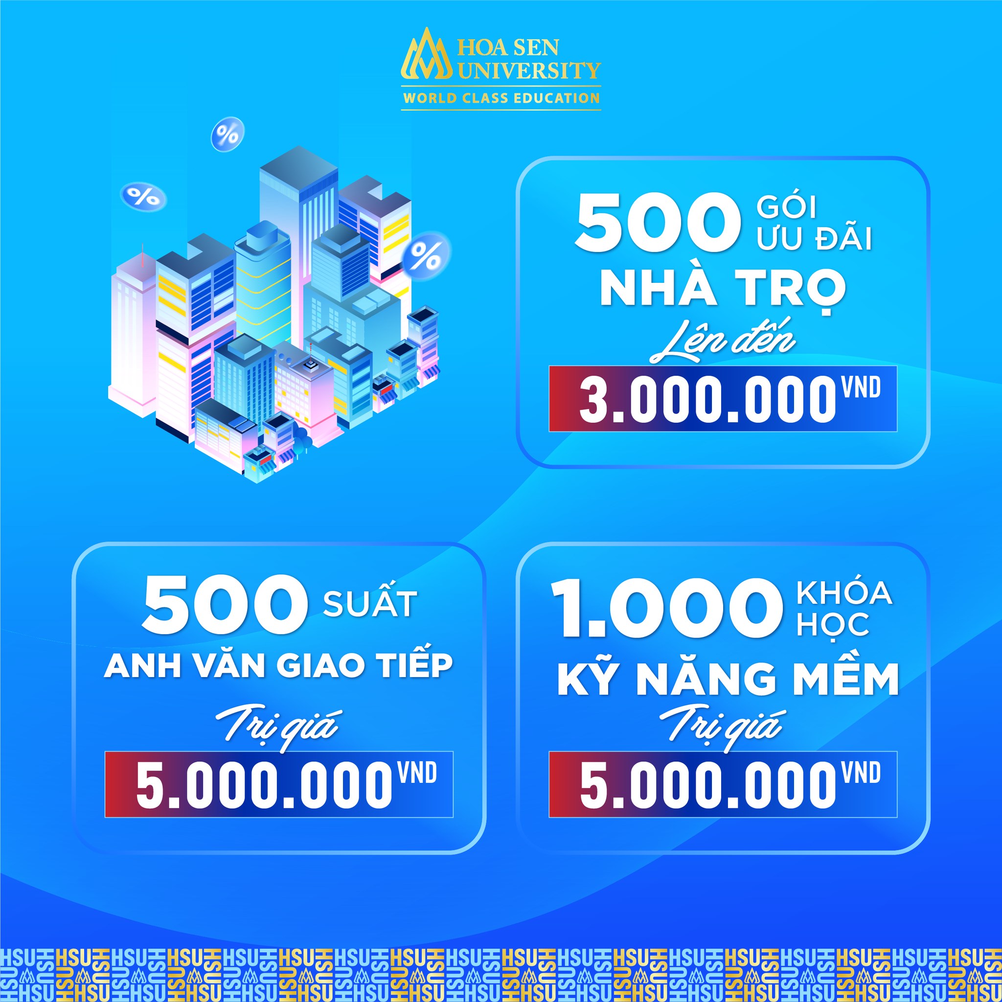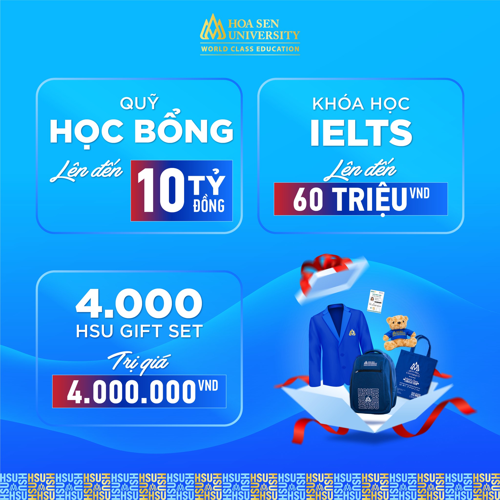 - 4.000 HSU Gift Set trị giá 4.000.000 đồng: Khi nhập học tại HSU, sinh viên được cấp tài khoản để photo miễn phí và nhận các phần quà như balo, bình nước, áo thun…