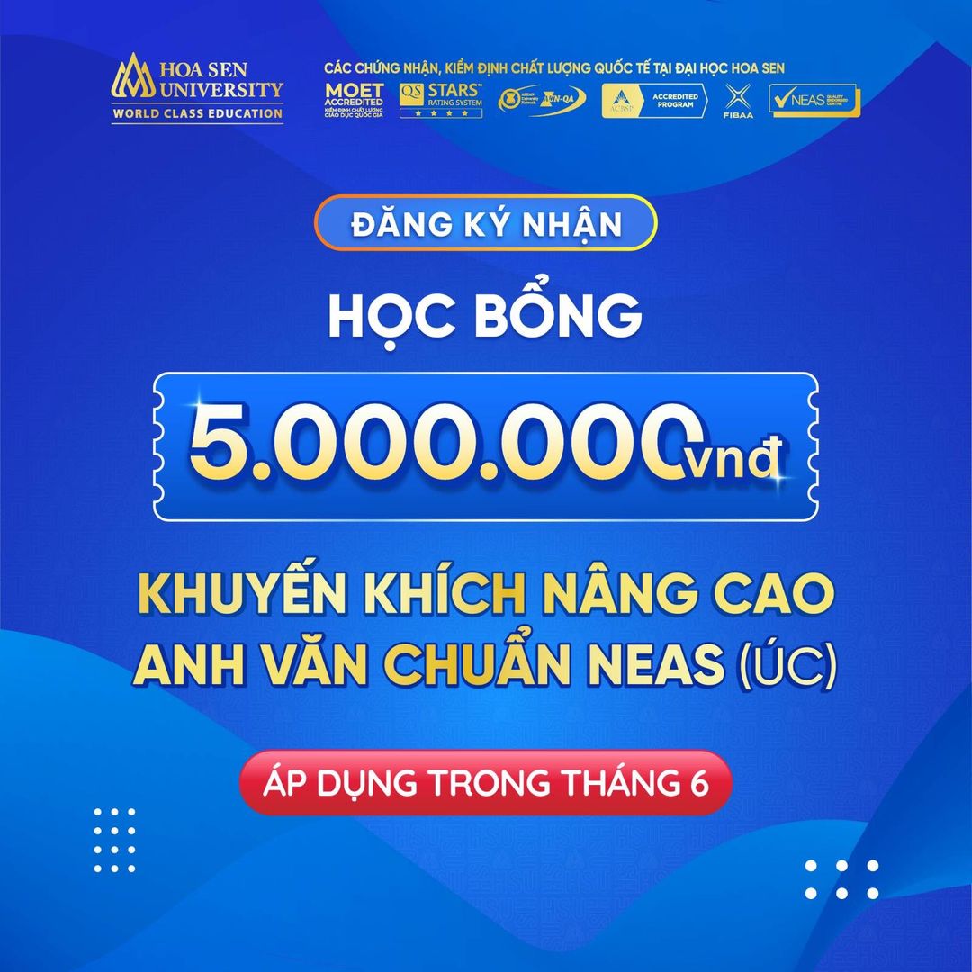 - KHÓA HỌC TIẾNG ANH NÂNG CAO CHUẨN NEAS (Úc) DUY NHẤT tại HSU trị giá 5 triệu đồng áp dụng cho các thí sinh đăng ký xét tuyển vào tất cả các ngành tại Hoa Sen. Khóa học sẽ tổ chức vào tháng 7 tới đây.