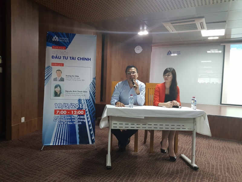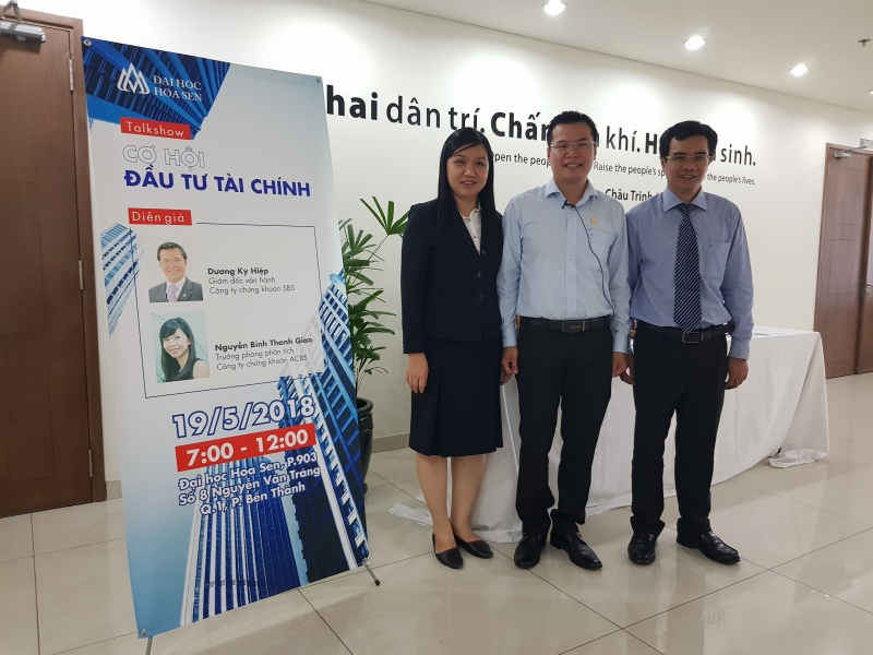 Buổi Talkshow “Cơ hội đầu tư tài chính” ngày 19/05/2018 tại trường Đại học Hoa Sen với sự góp mặt của hai diễn giả dày dạn kinh nghiệm trong ngành tài chính là anh Dương Kỳ Hiệp (Giám đốc vận hành công ty chứng khoán SBS) và chị Nguyễn Bỉnh Thanh Giao (Trưởng phòng phân tích công ty chứng khoán ACBS). Phần đầu chương trình, chị Thanh Giao đã giới thiệu tổng quan kinh tế và đầu tư ở Việt Nam trong năm 2018. Chị đã đưa ra những con số ấn tượng như tăng trưởng GDP quý 1 2018 đạt 7.38% cao hơn so với mức mong đợi là 6.7%. Bên cạnh đó, một số ngành được cho là hy vọng thông qua kết quả từ quý I trong 2018 như ngành xây dựng 4.4%, ngành bất động sản 3.5%, ngành bán lẻ, dịch vụ- du lịch 7.6%. Sau đó, anh Hiệp đã đưa ra “những con số biết nói” với những câu chuyện đầu tư tài chính từ chính kinh nghiệm bản thân. Ngoài ra, anh cũng nhấn mạnh thị trường Việt Nam đang có lợi thế từ các dòng tiền nước ngoài được đổ vào thị trường chứng khoán khi VN-Index tăng 16% trong quý I/2018.