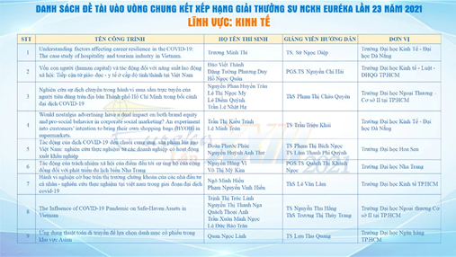 Giải thưởng Sinh viên Nghiên cứu Khoa học – Euréka Thành đoàn TP.HCM lần thứ 23 năm 2021, có 1.252 đề tài của 132 trường Đại học, Cao đẳng, Học viện, trong đó có 47 trường thuộc khu vực thành phố Hồ Chí Minh và 85 trường thuộc các tỉnh thành khác trong cả nước tham dự.